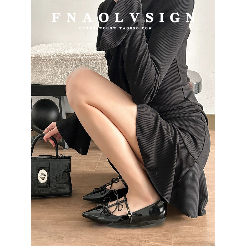 羊皮版~法式蝴蝶结尖头浅口单鞋女新款T字扣带一脚蹬平底玛丽珍鞋