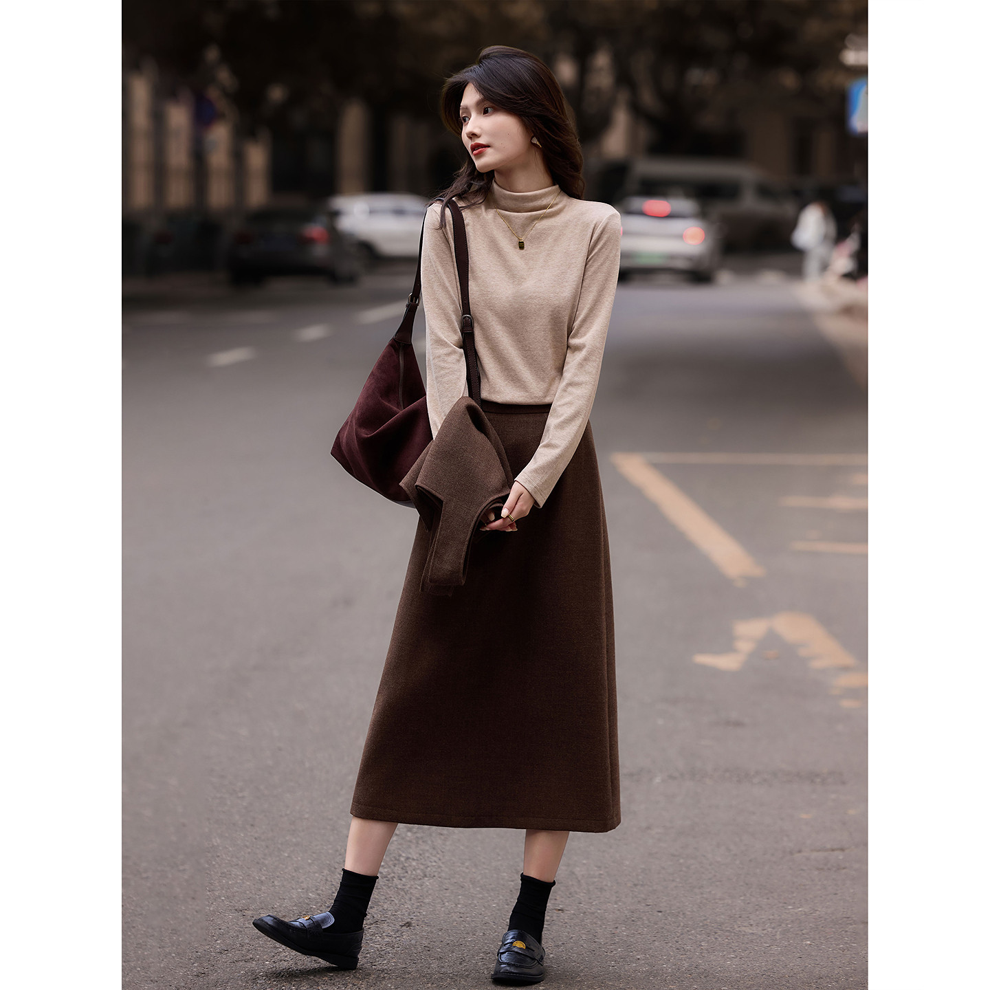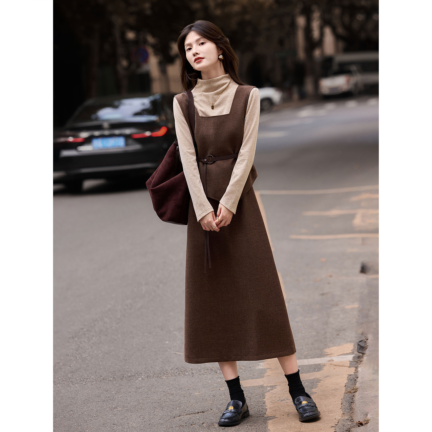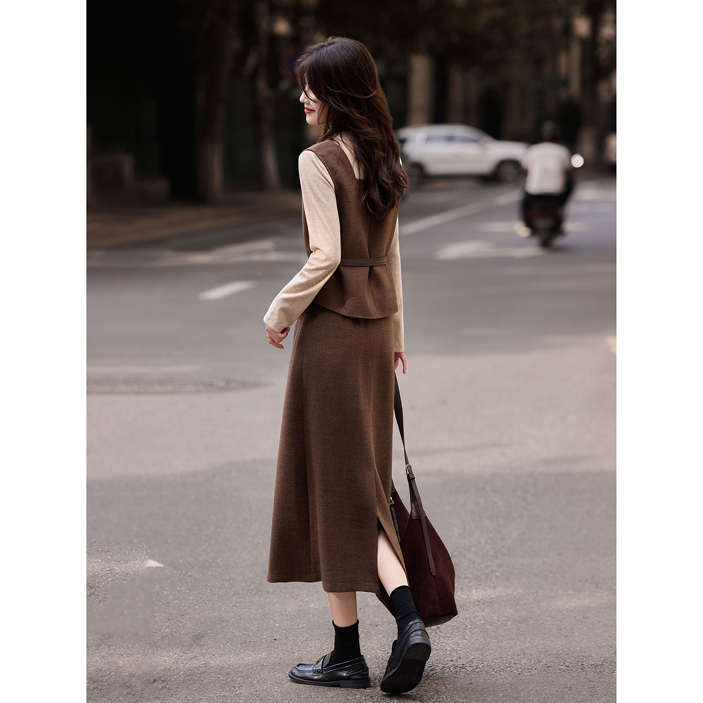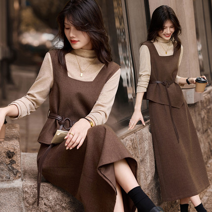 通勤套装秋冬针织衫配腰带呢子马甲中长半裙三件套