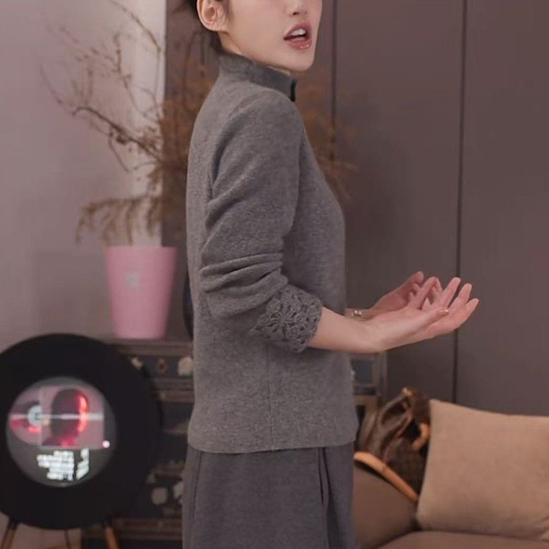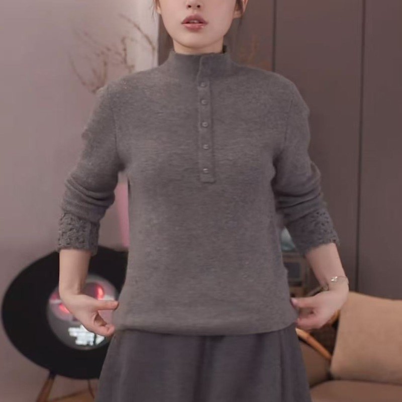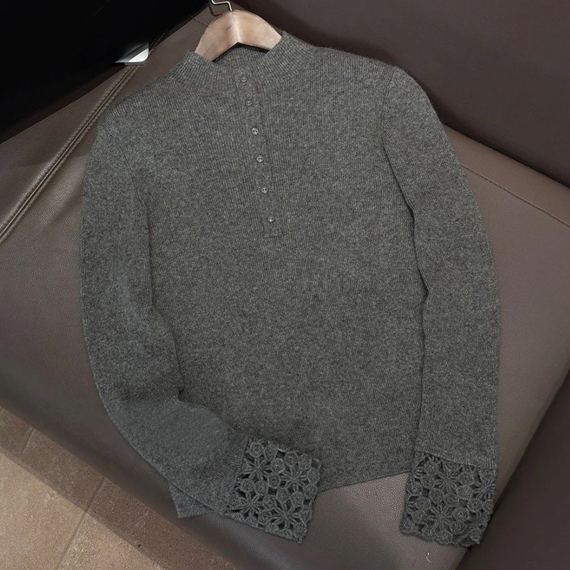 灰色半高领套头毛衣女秋冬慵懒风宽松显瘦钩花蕾丝打底针织衫上衣
