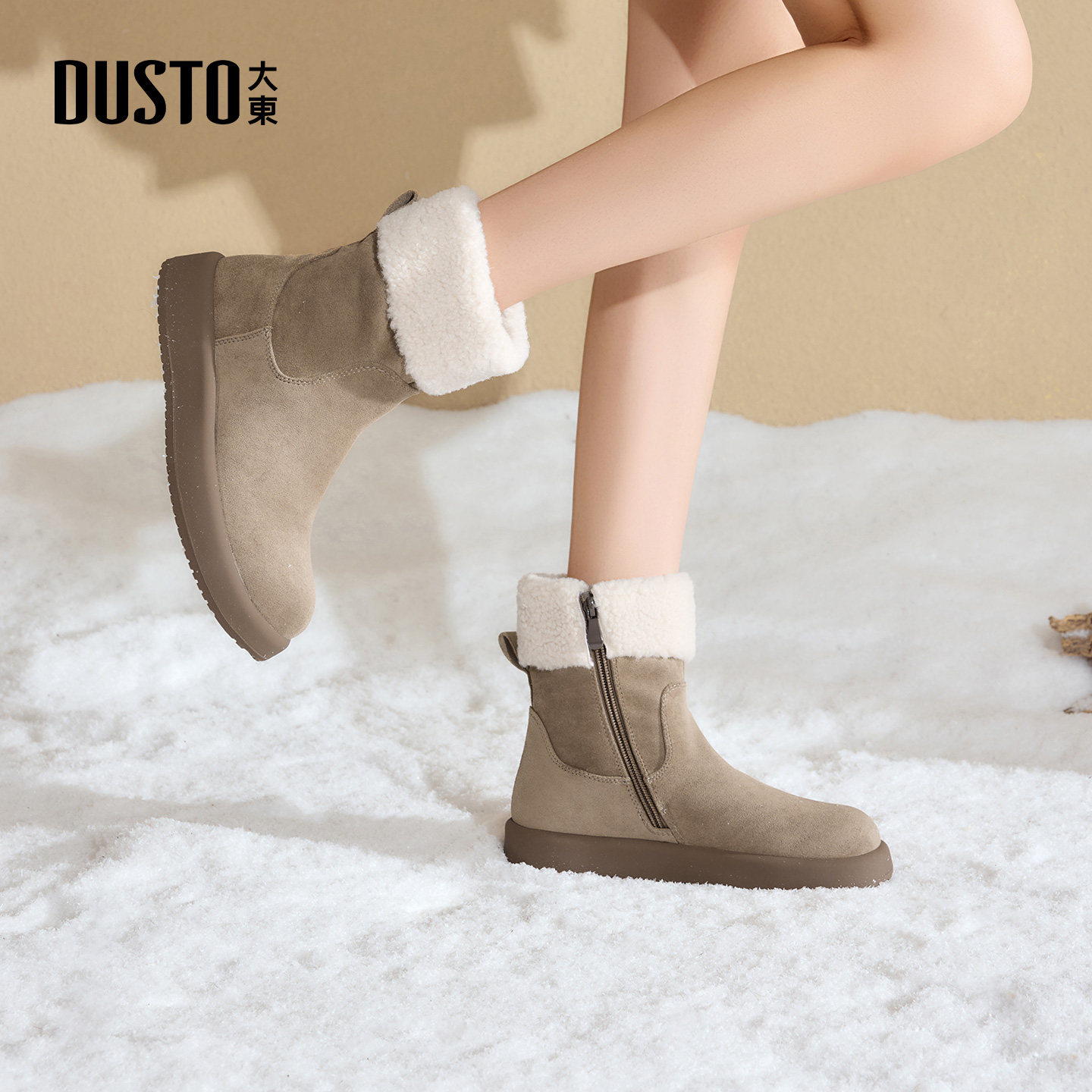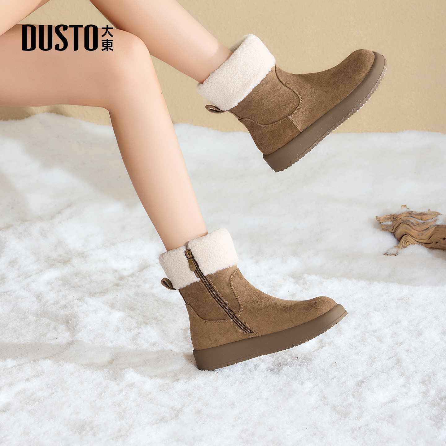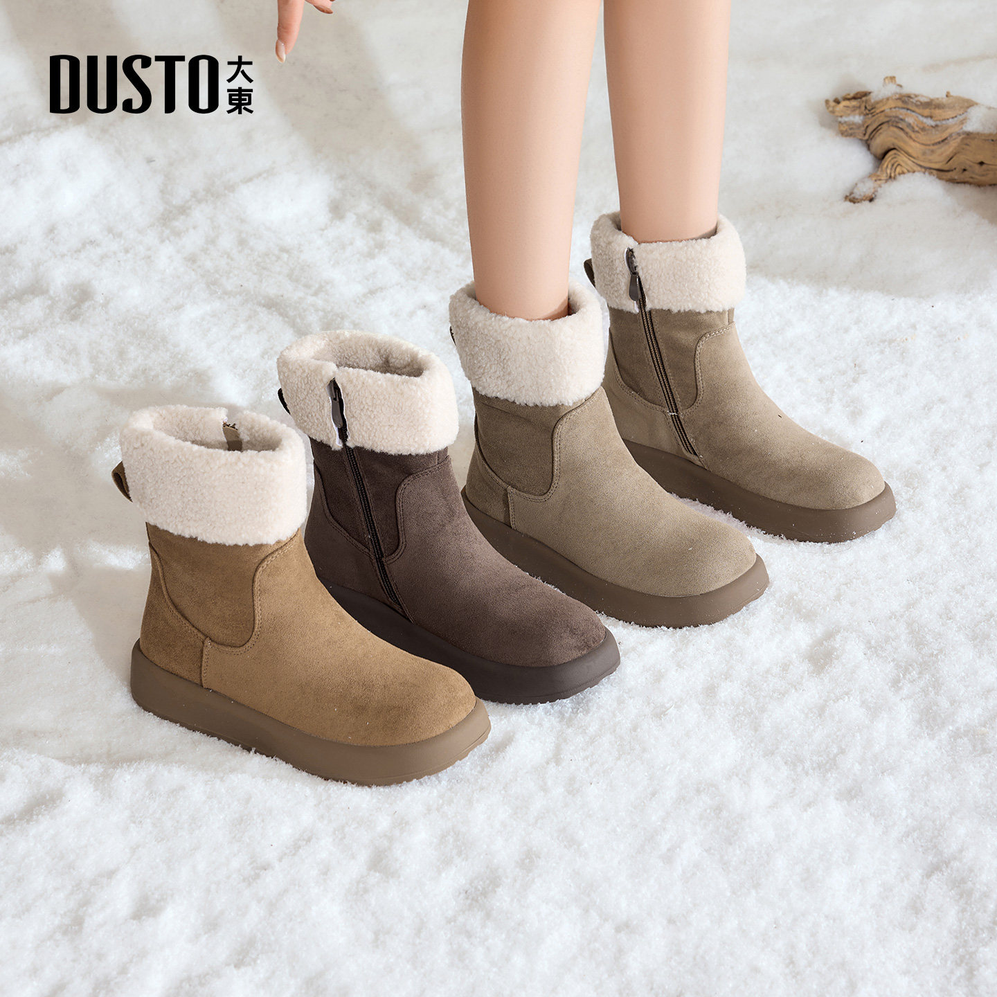大东女鞋雪地靴2025冬季新款时尚加绒短筒时装靴女靴侧拉链中筒靴
