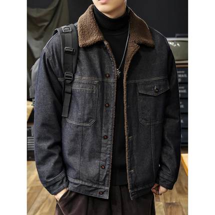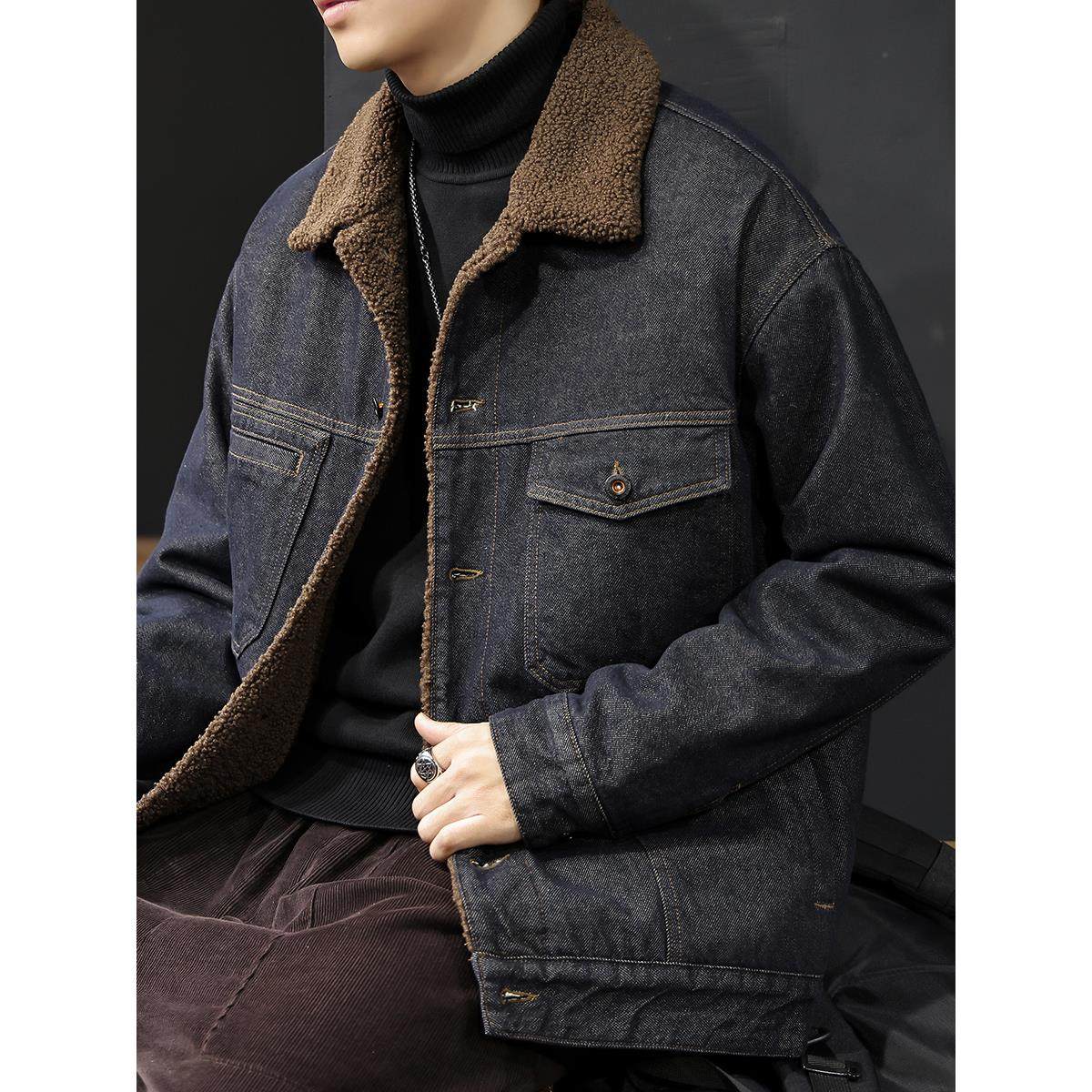 美式原浆丹宁羊羔绒牛仔外套男2026冬季新款加绒加厚保暖棉服夹克