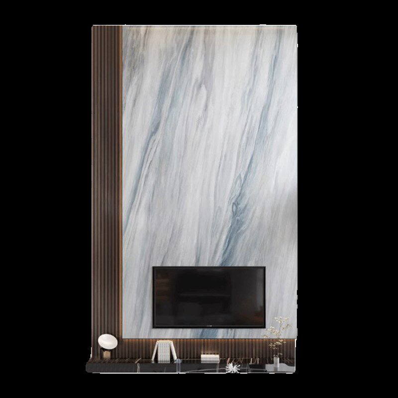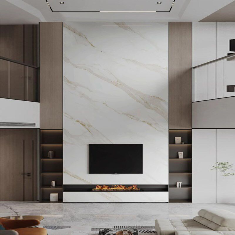 新中式别墅客厅复式楼悬空岩板背景墙中空挑高瓷砖背景墙大理石材