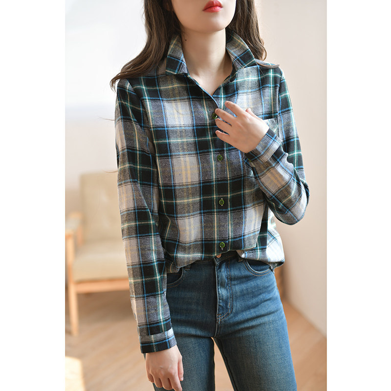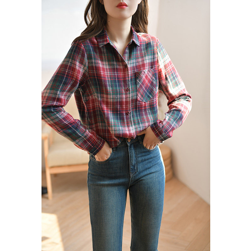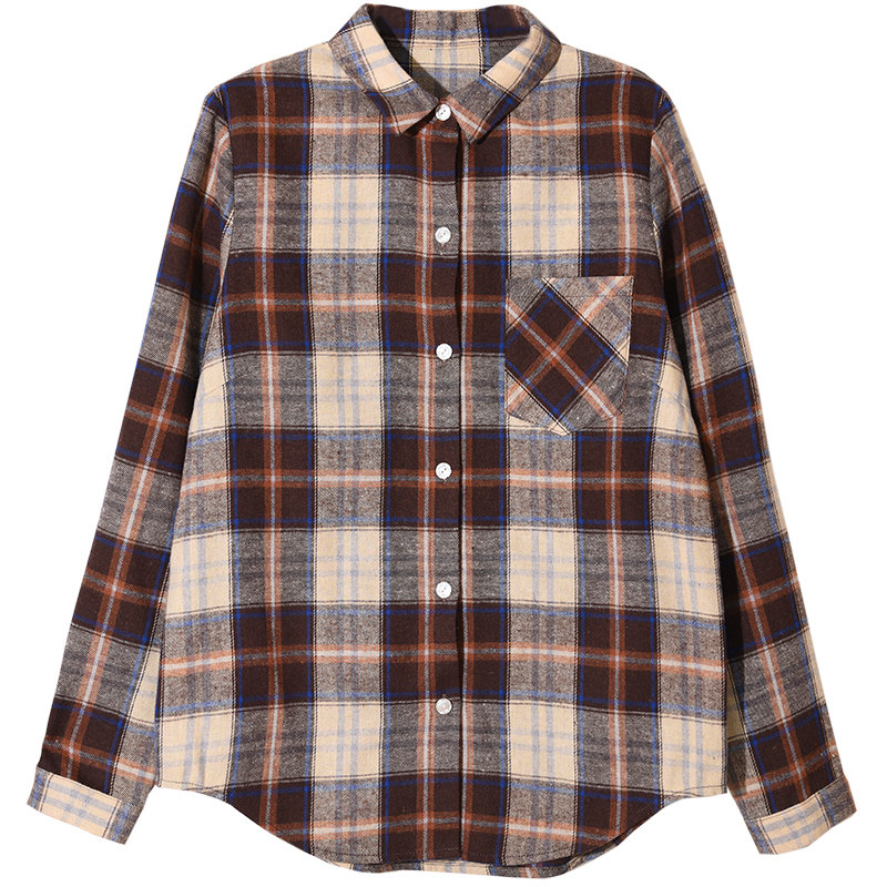 GESGOO撞色格子磨毛衬衫女秋冬2024新款休闲复古翻领叠穿衬衣内搭