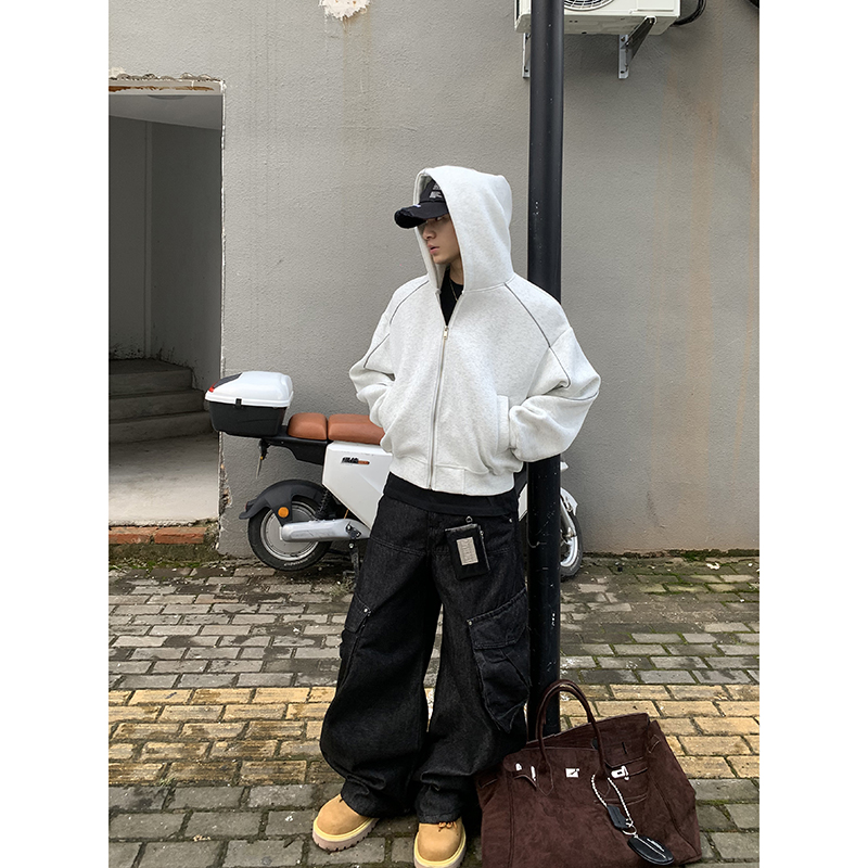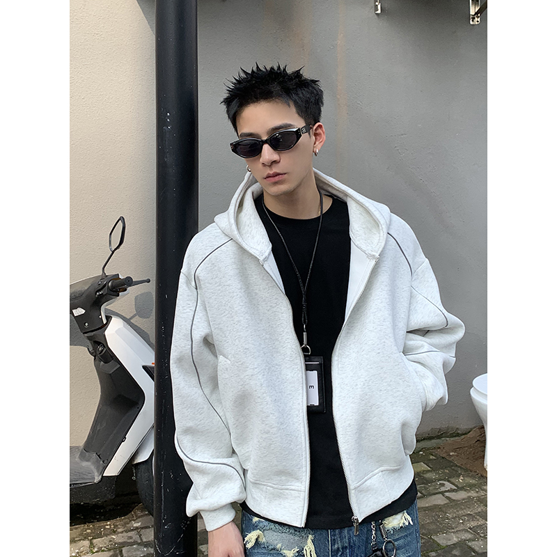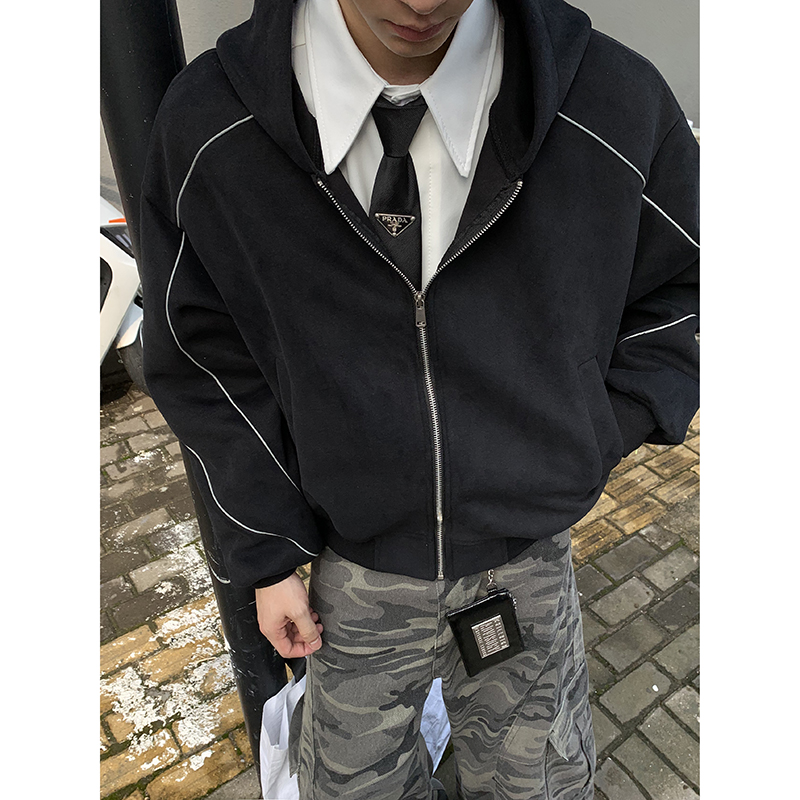 PLTH*美式简约反光条拼接连帽开衫卫衣男女休闲运动短款拉链外套