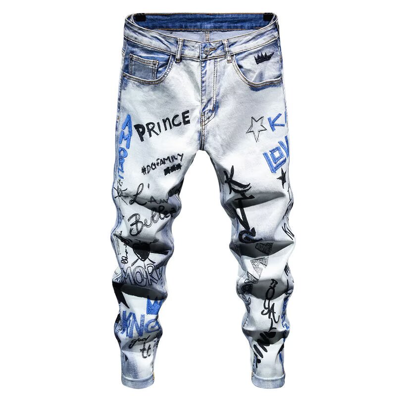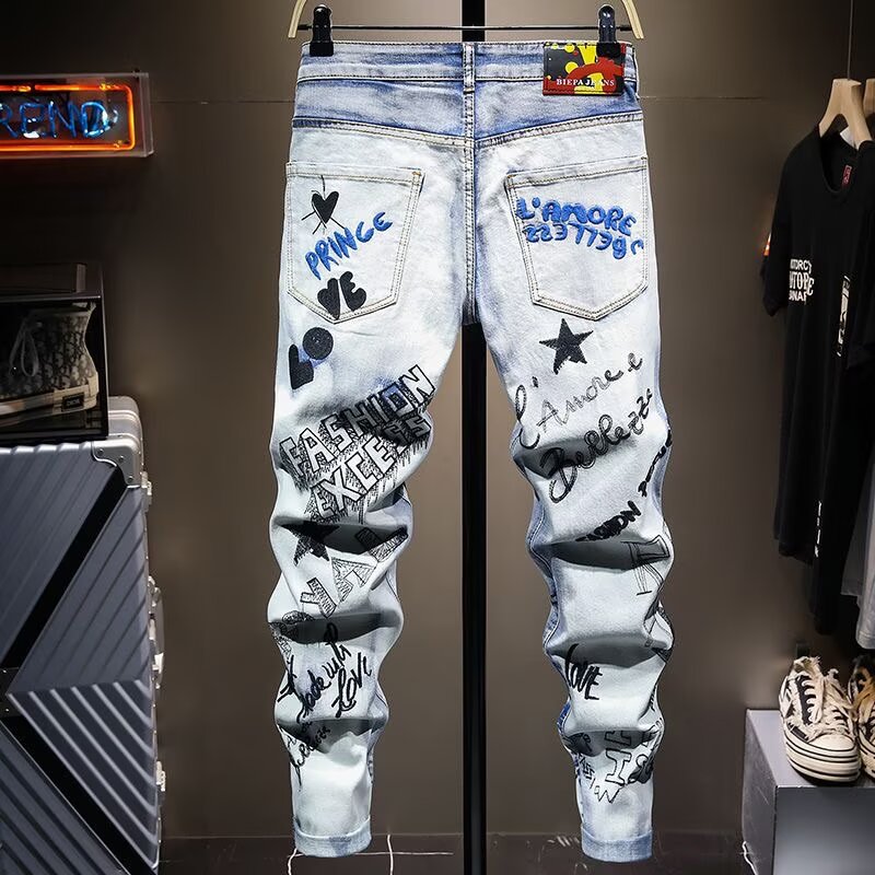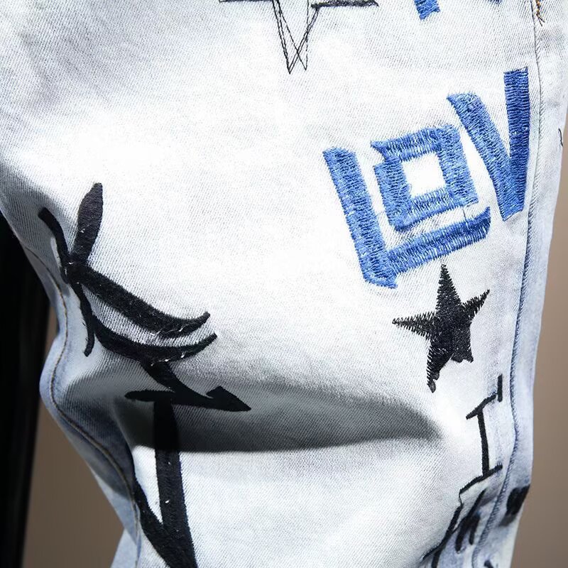 高端牛仔裤男秋季2025新款修身小脚印花刺绣韩版潮流春秋休闲长裤