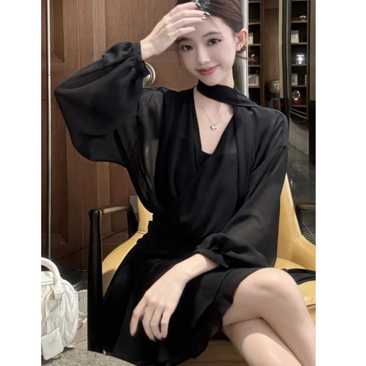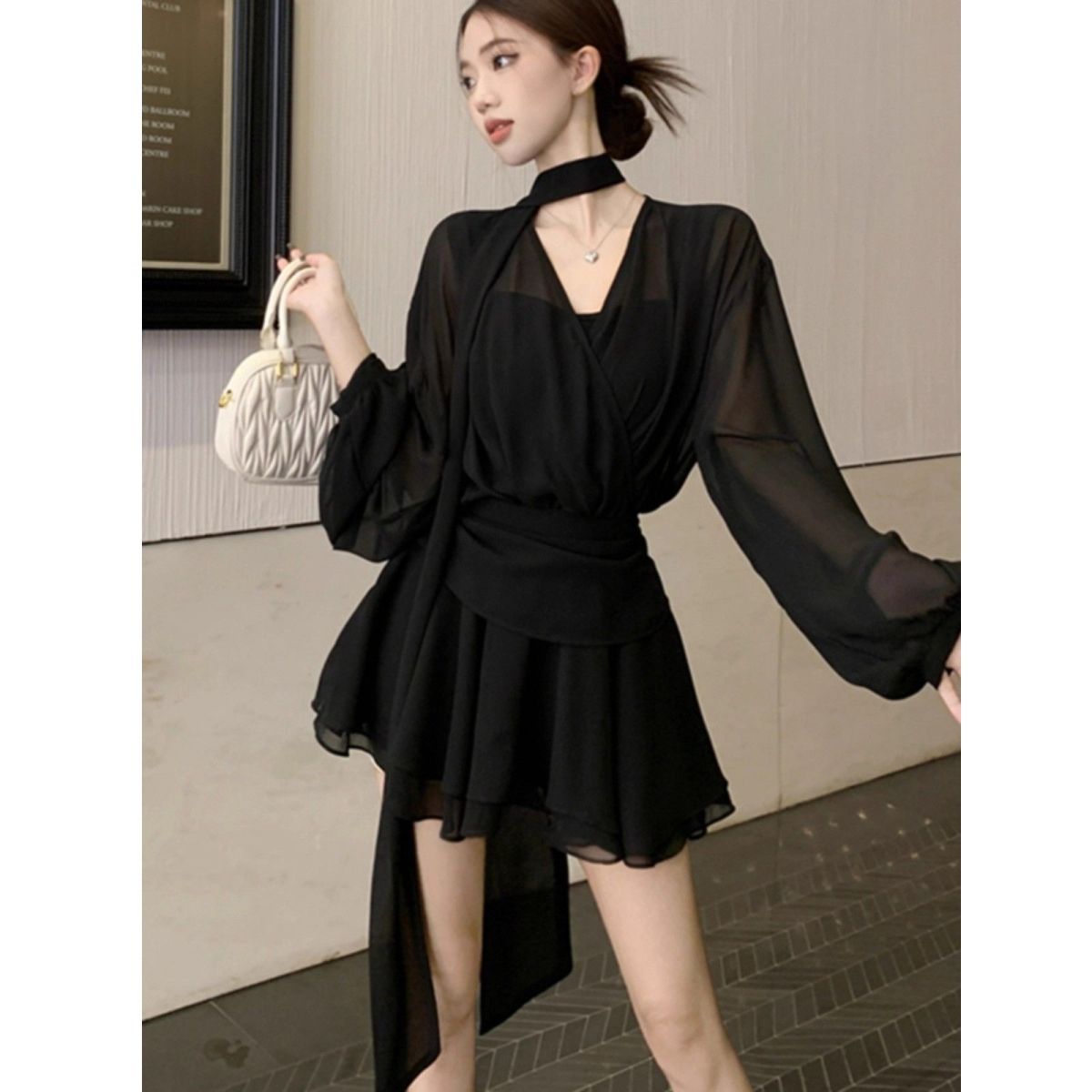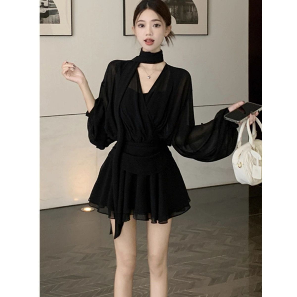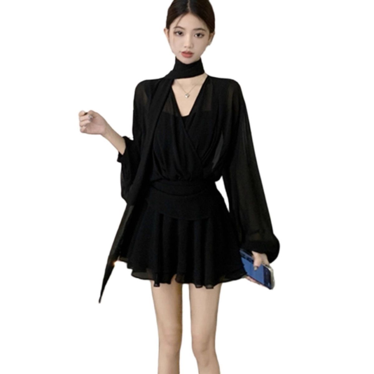气质性感V领长袖衬衫连衣裙女夏季大码胖mm新款雪纺显瘦短裙黑裙
