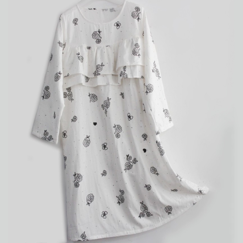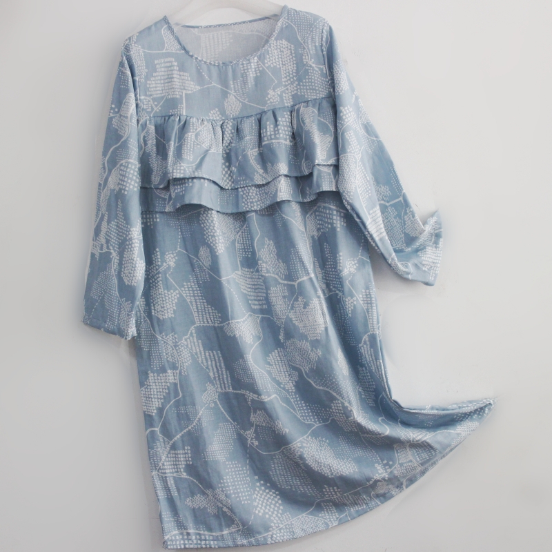 纯棉纱布睡裙长袖遮胸胸前双层荷叶边连衣裙防凸点全棉家居服夏女