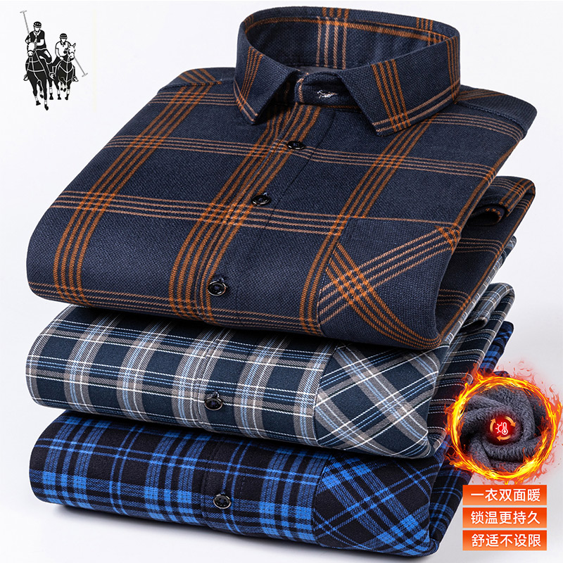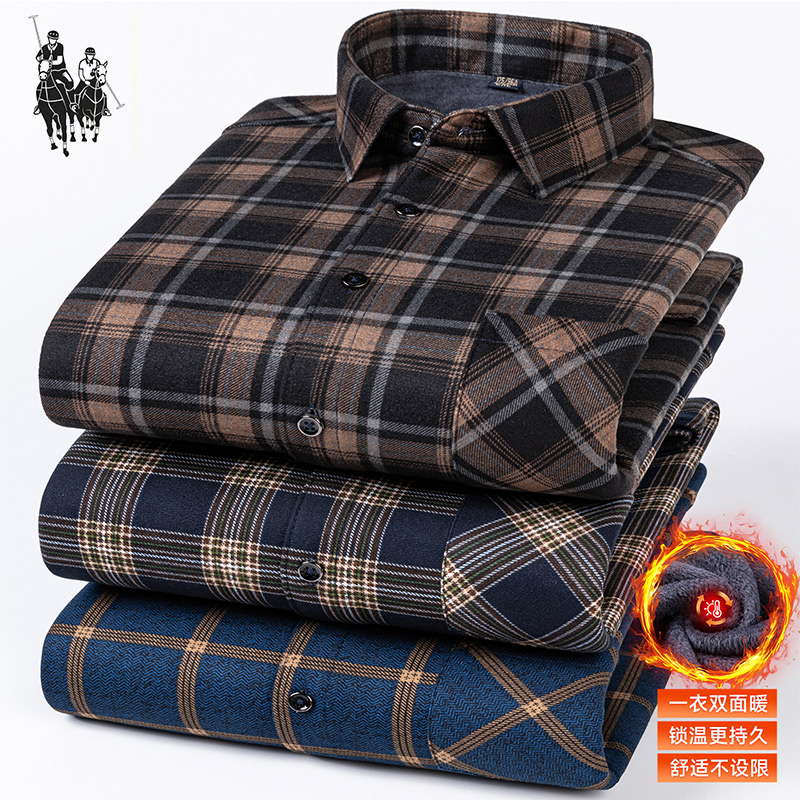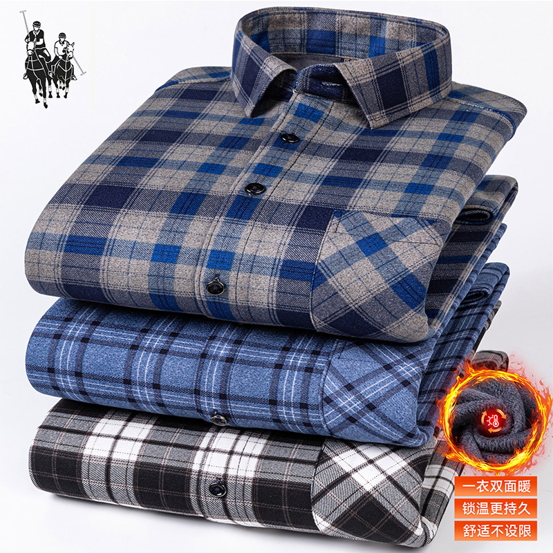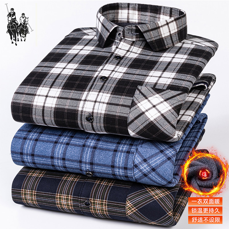 保罗冬季保暖衬衫男士加绒加厚新款格子长袖休闲中老年爸爸衬衣男