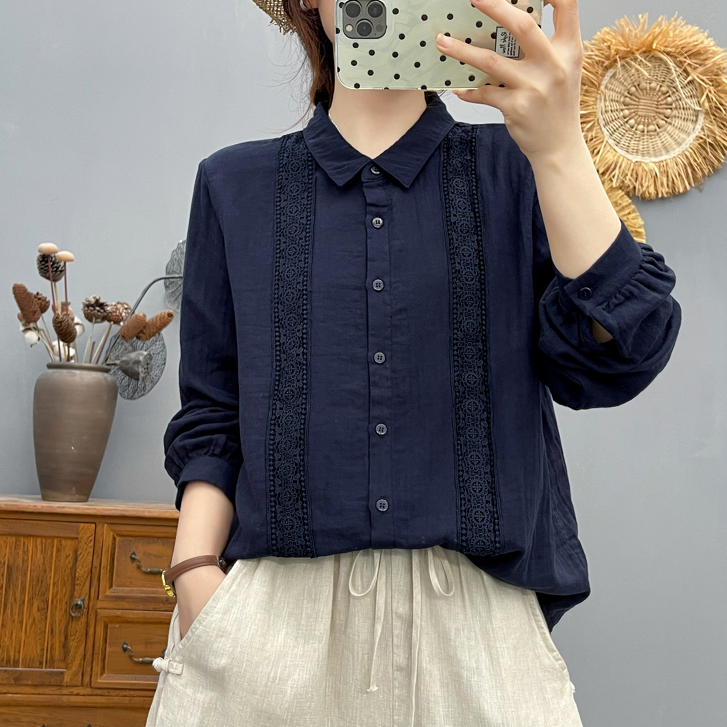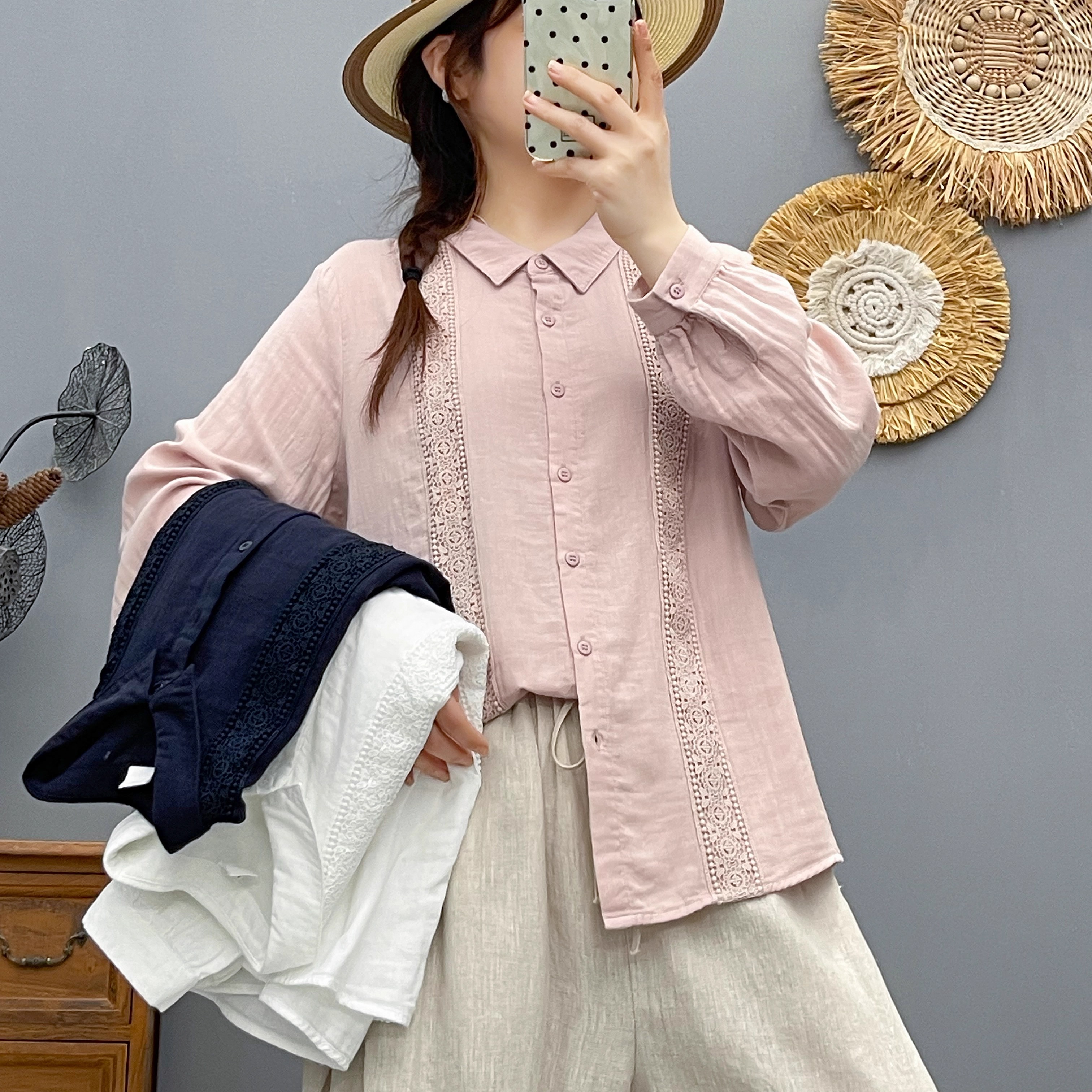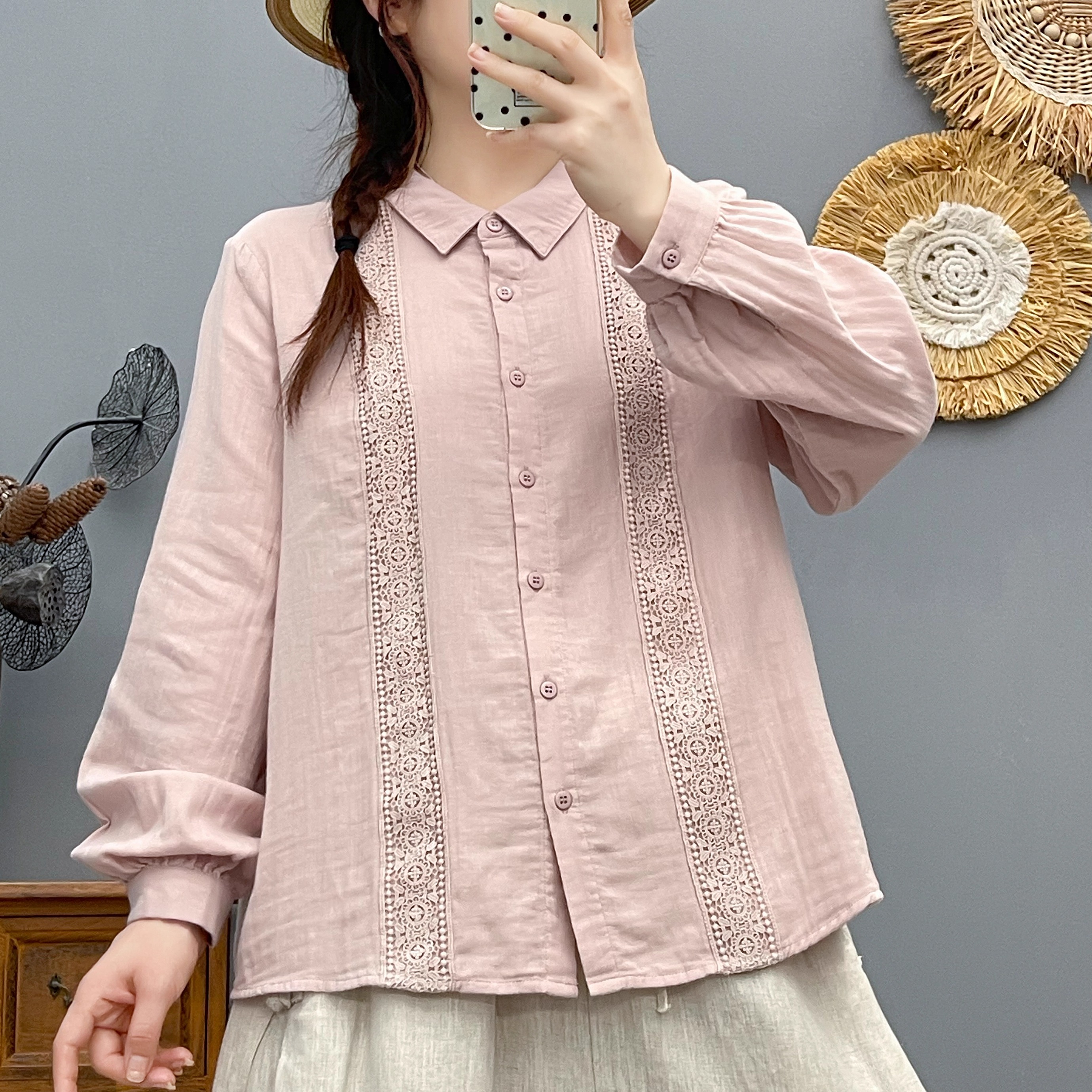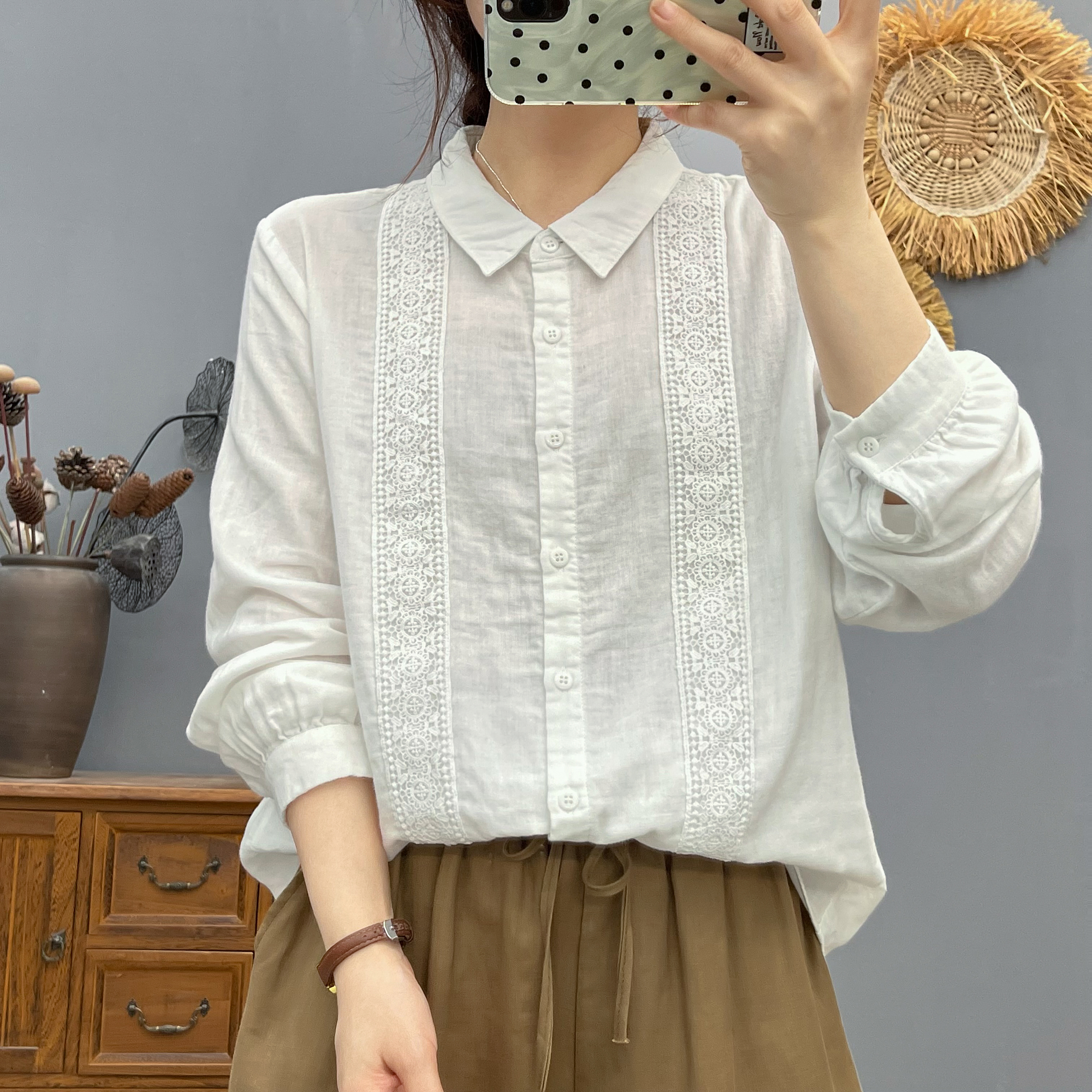 春秋新款全棉棉纱蕾丝花边长袖女士衬衫亲肤百搭休闲打底衬衣潮
