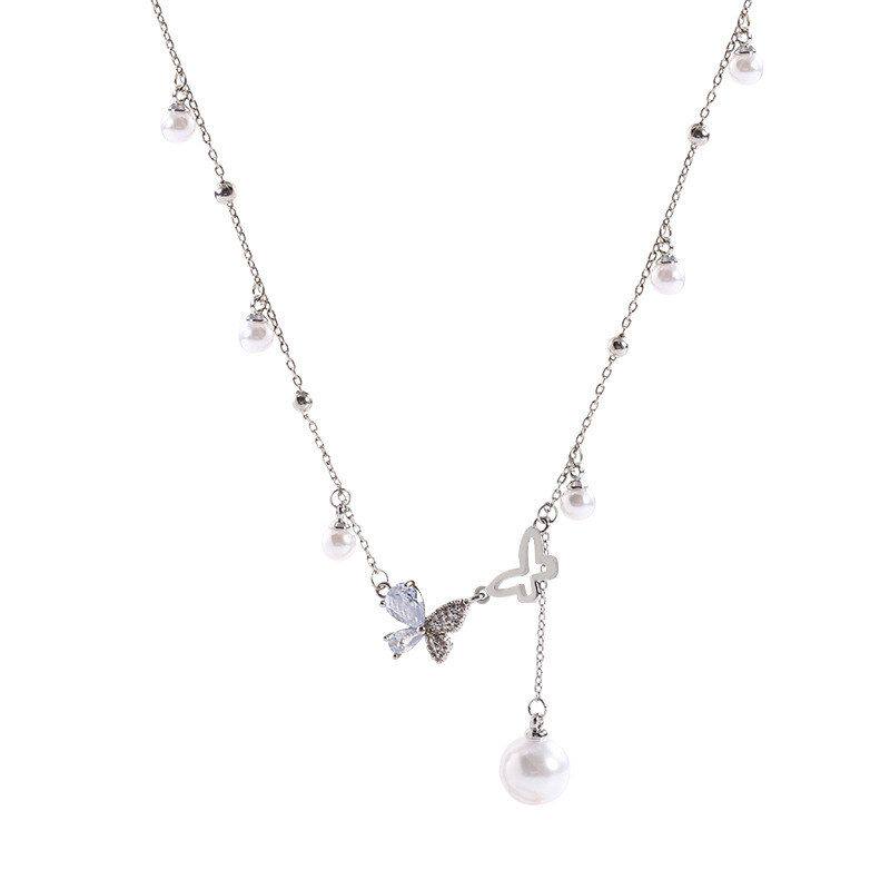 珍珠流苏蝴蝶钛钢项链女设计感高级气质毛衣链锁骨链轻奢小众颈链