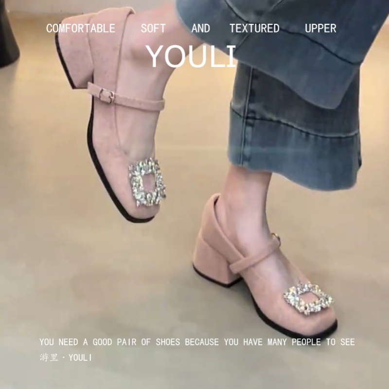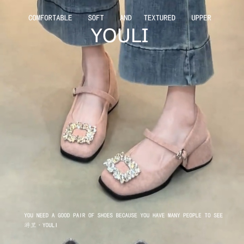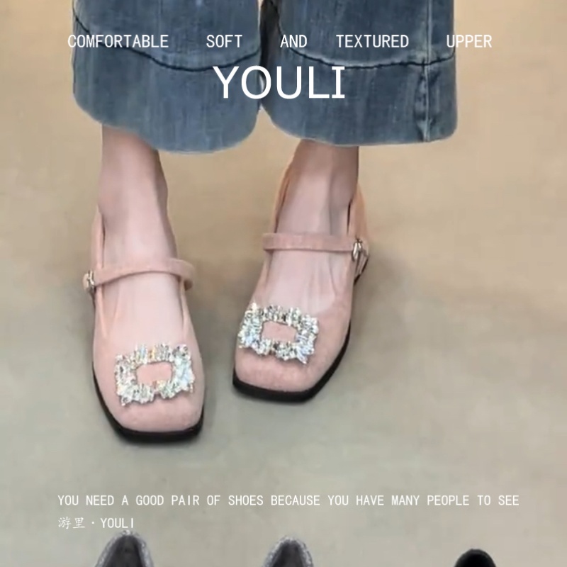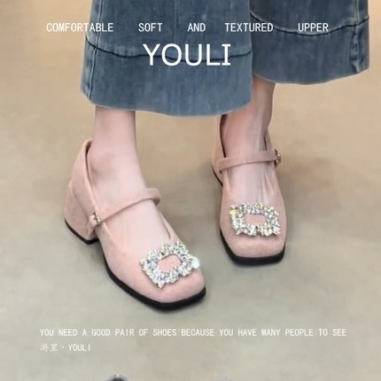 羊皮版~法式复古方头粗跟玛丽珍鞋女水钻方扣浅口单鞋