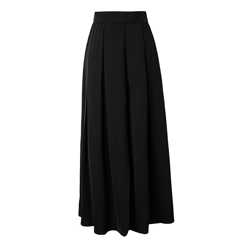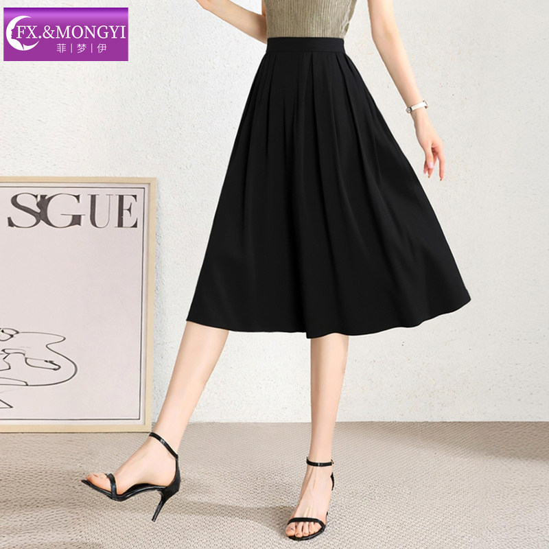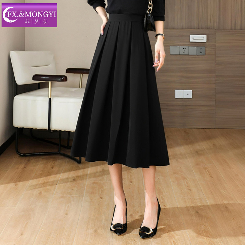菲梦伊黑色半身裙女春季垂感高腰挺廓版型遮跨中长款百褶A字伞裙