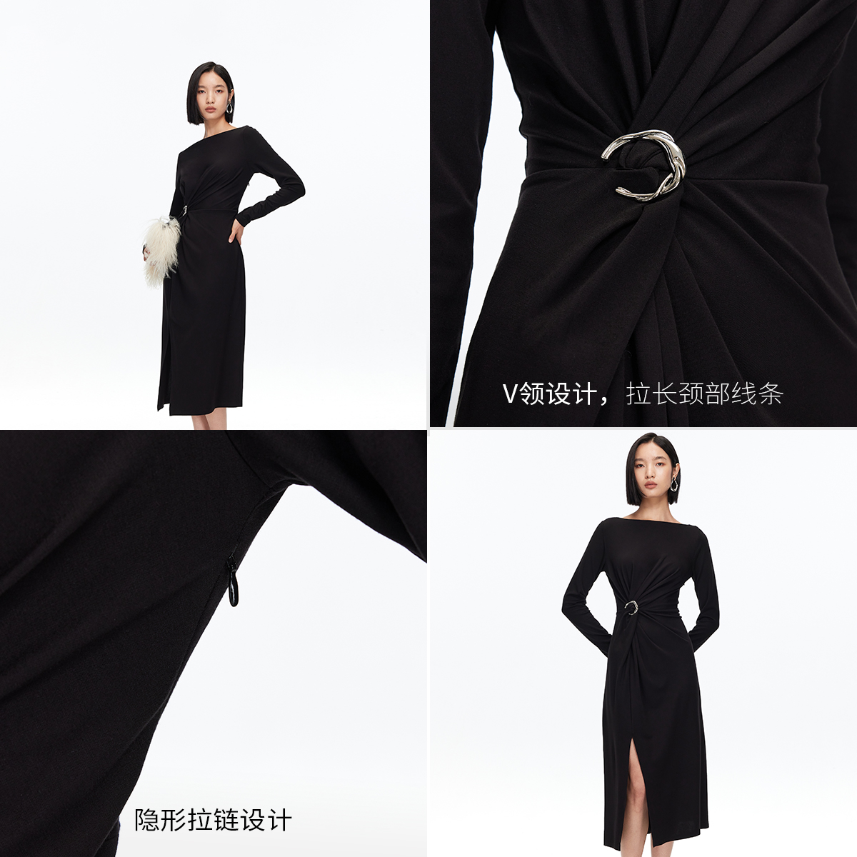 Vero Moda连衣裙2025秋季新款底摆开叉金属扣收腰中长裙时髦大气
