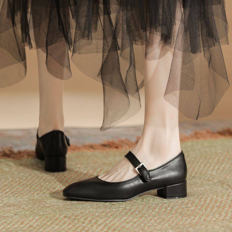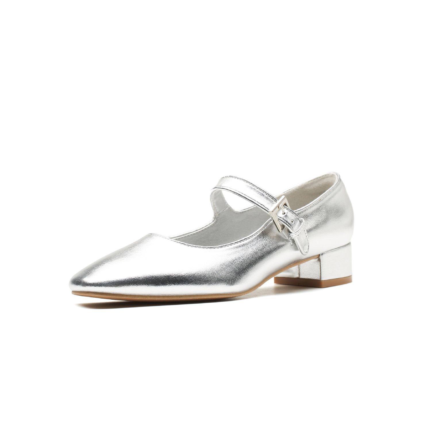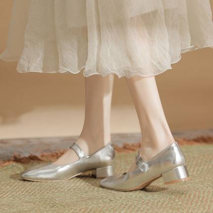 2026新款法式方头银色浅口单鞋女中跟一字扣带粗跟单鞋