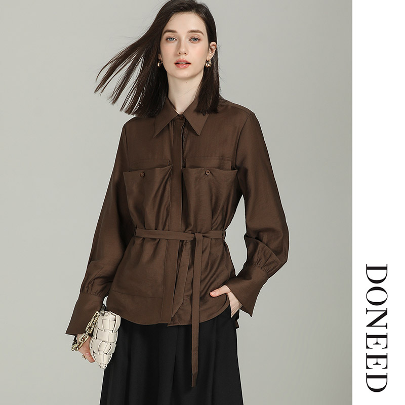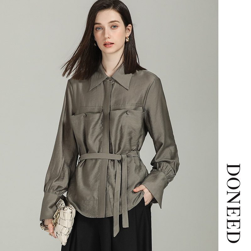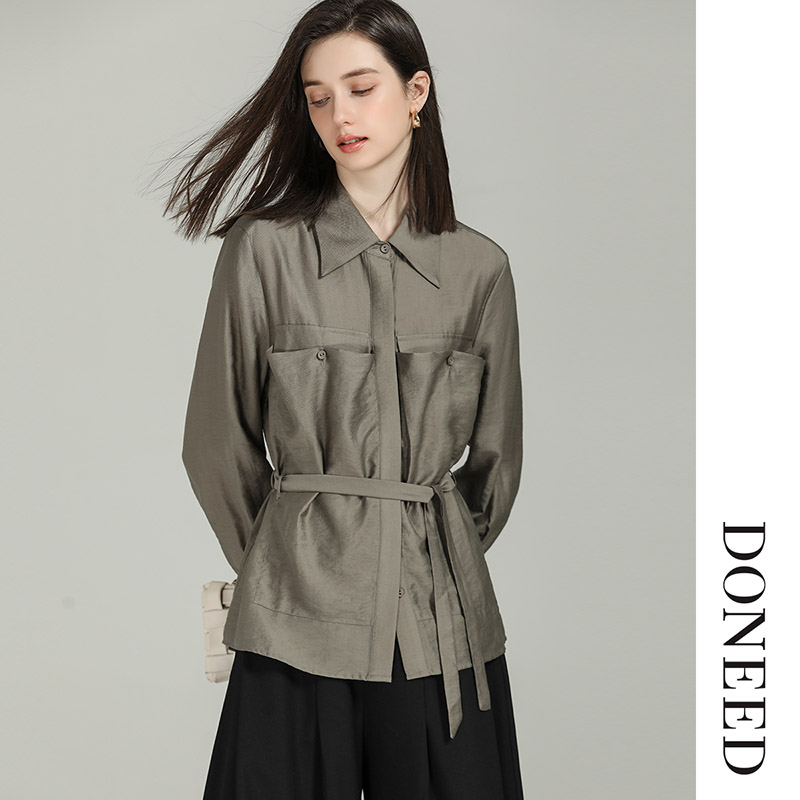 DONEED秋款慵懒气质通勤配腰带个性立体贴袋天丝长袖衬衫上衣女