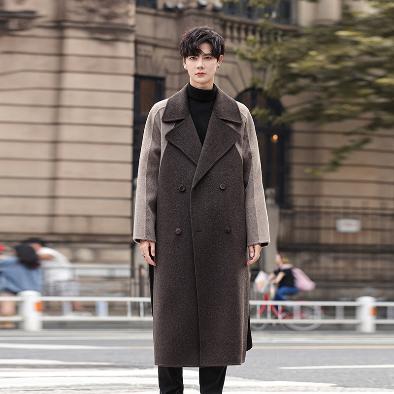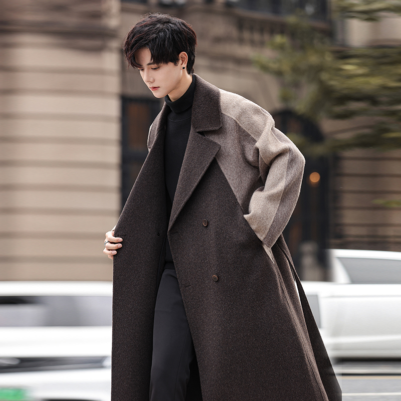 男士毛呢大衣过膝中长款羊毛风衣拼接撞色翻领双面呢子高级感外套