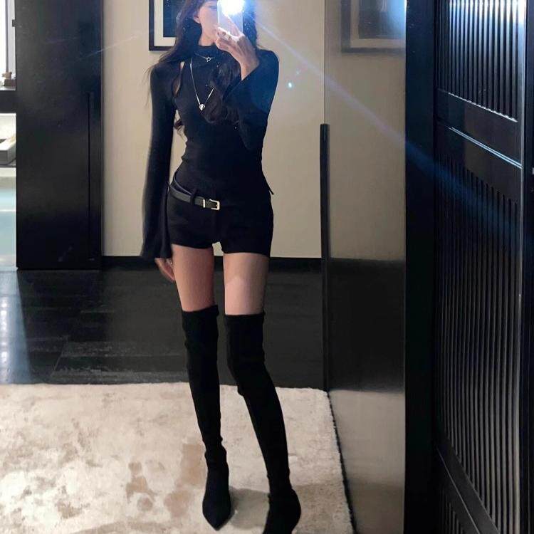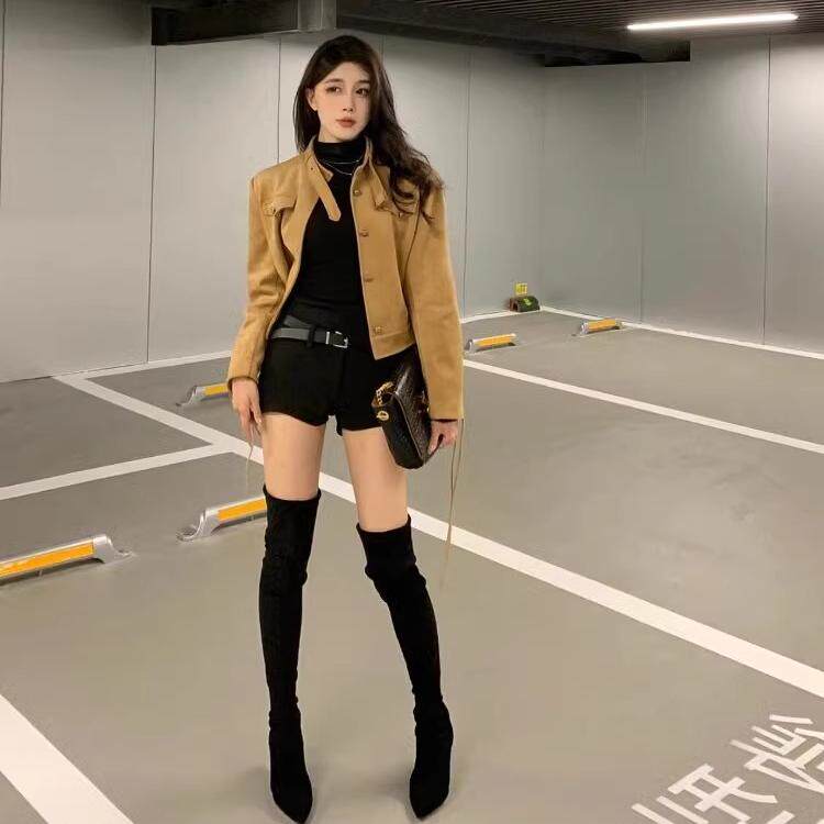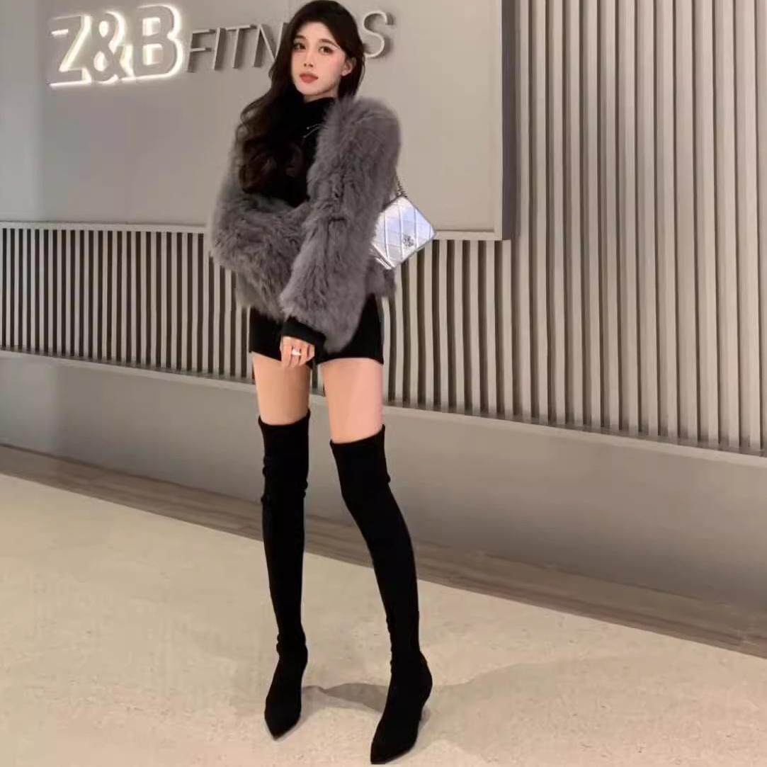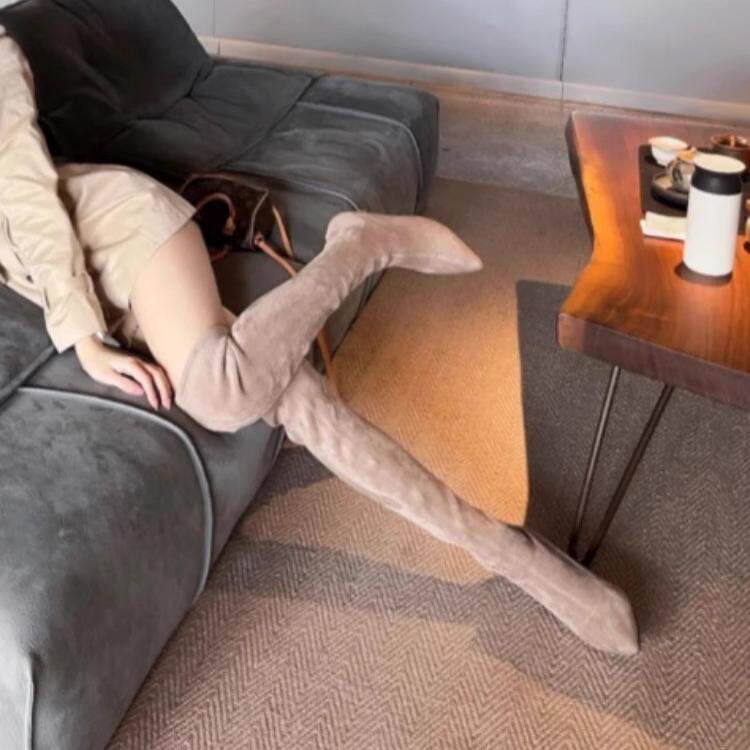 过膝长靴绒面高跟鞋尖头细跟尖头