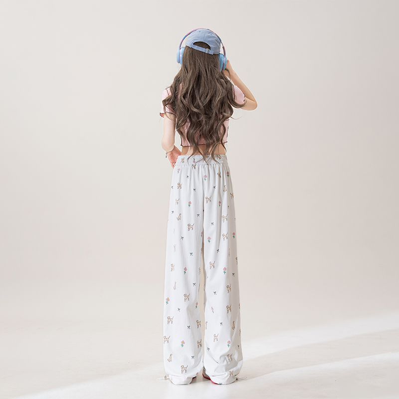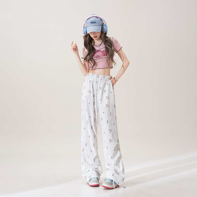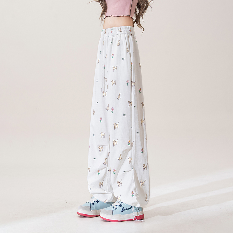 Nurtureone白色小狗印花工装裤女秋季新款蕾丝抽绳直筒休闲阔腿裤