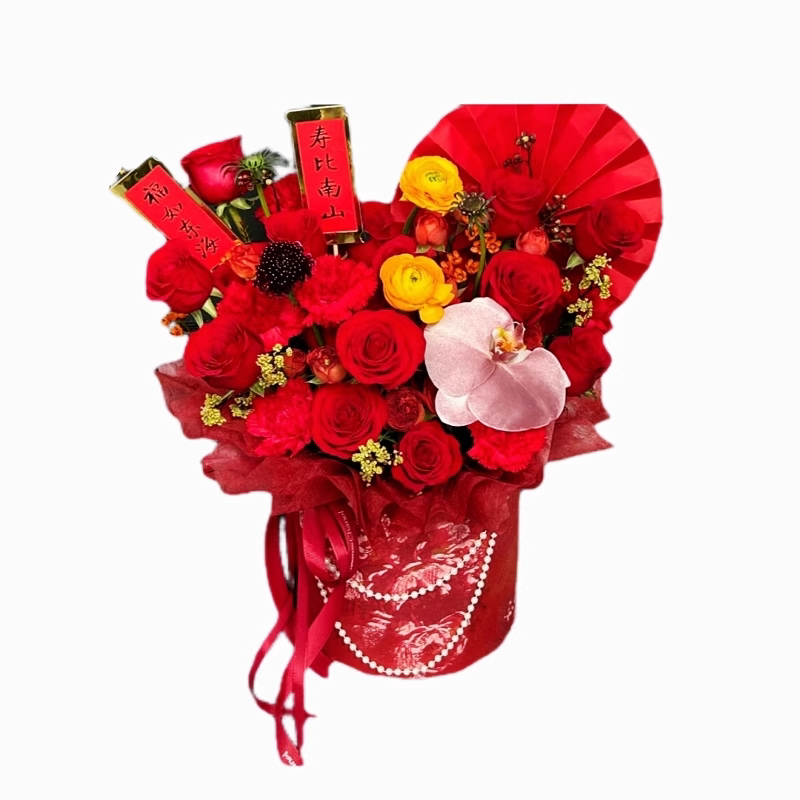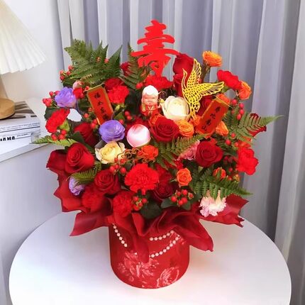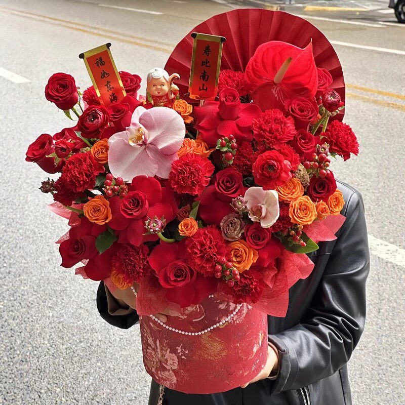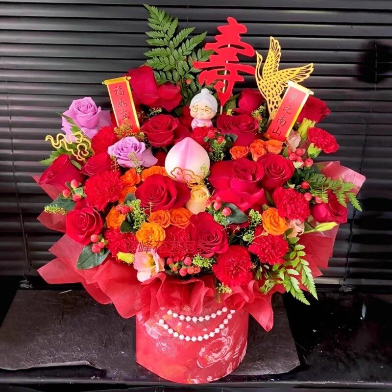 红色喜庆祝寿鲜花插花抱抱桶花桶