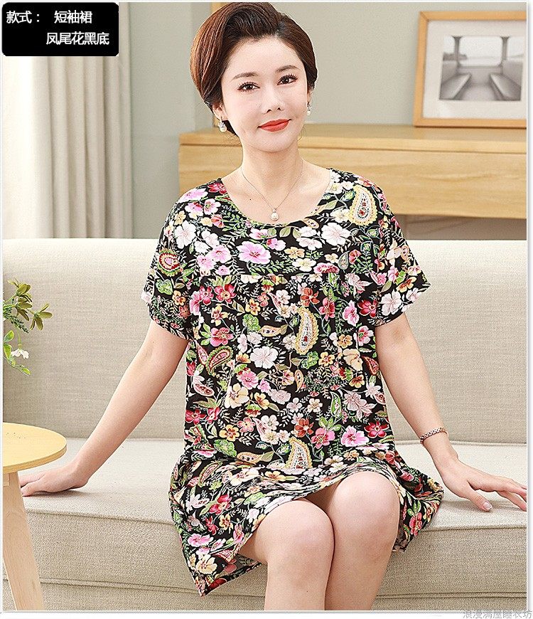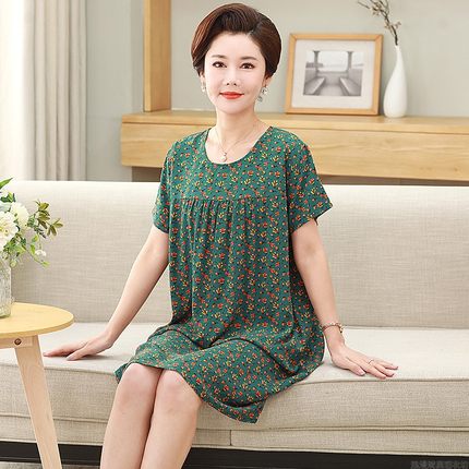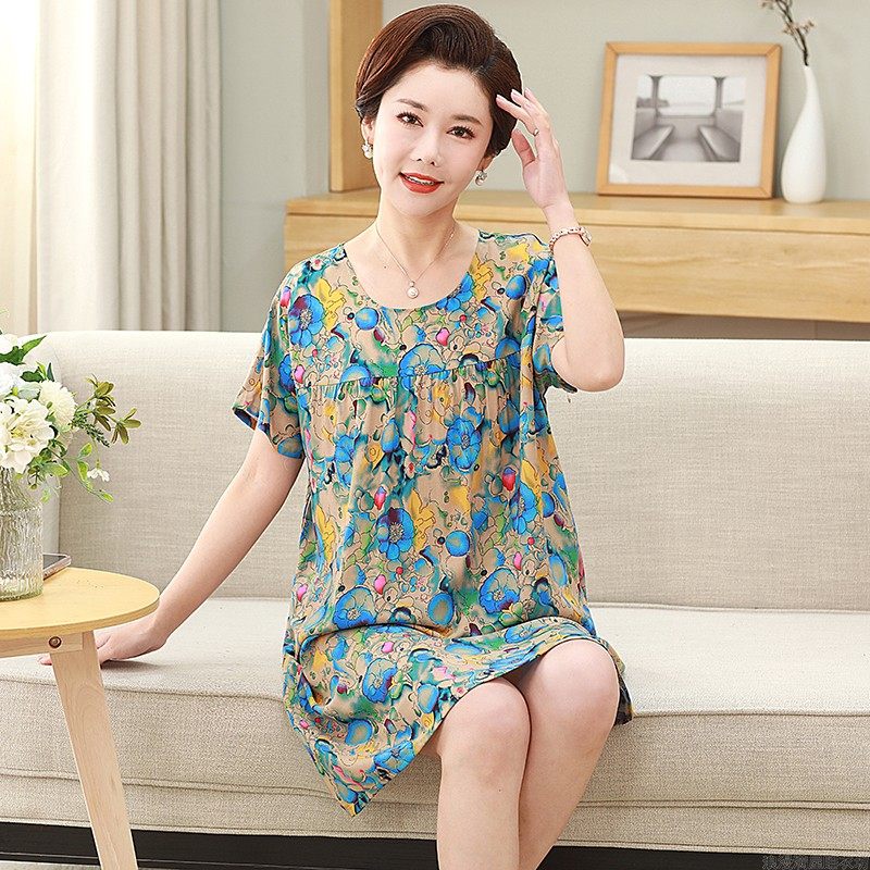 中老年睡衣女纯棉妈妈绵绸睡裙夏季薄款可外穿大码人造棉绸连衣裙