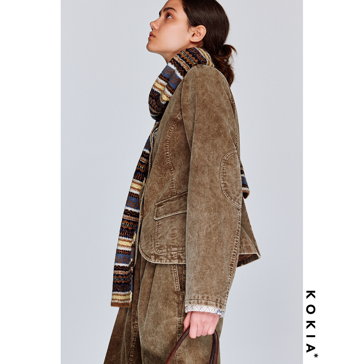 KOKIA 重工假两件立领 复古砂洗雪花灯芯绒 肘部补丁收腰短外套