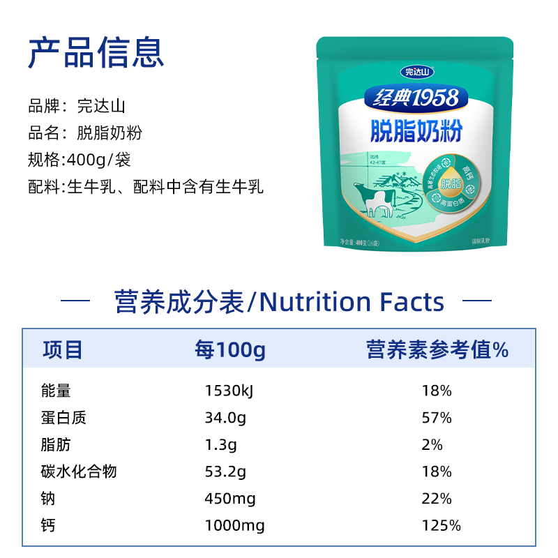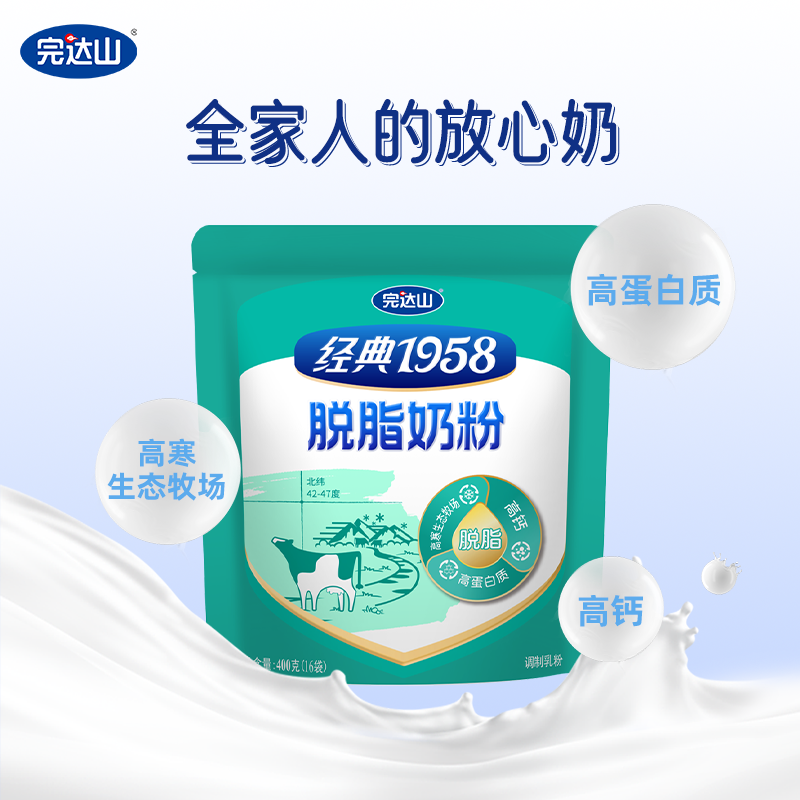 完达山1958高钙脱脂学生成人中老年人脱脂奶粉400g/袋
