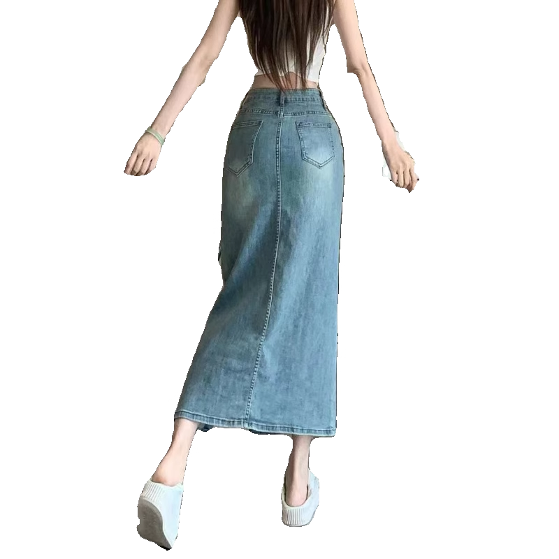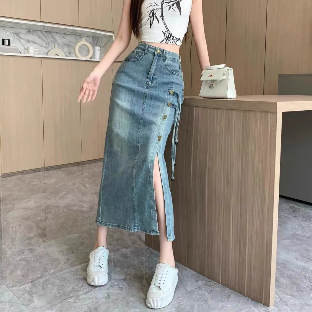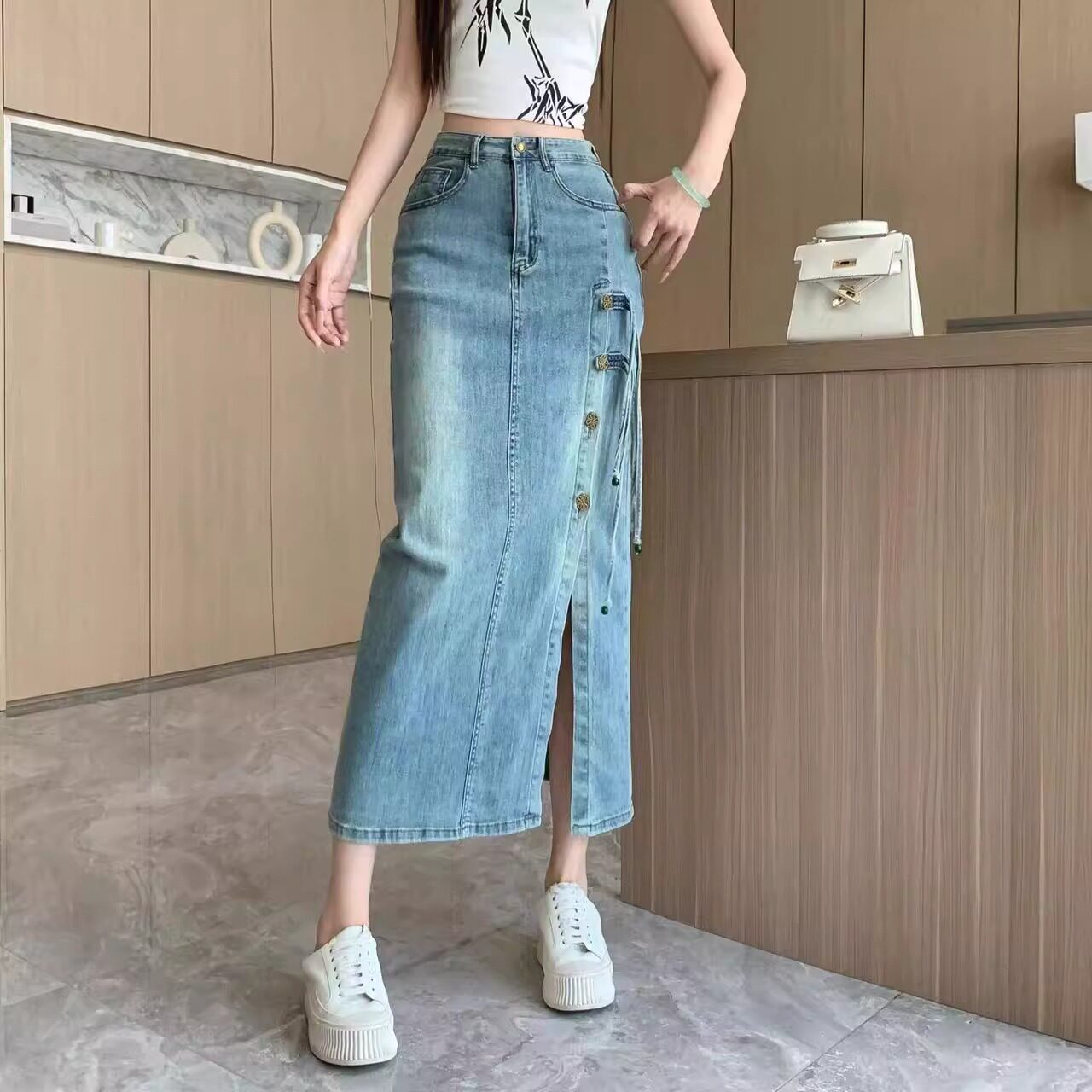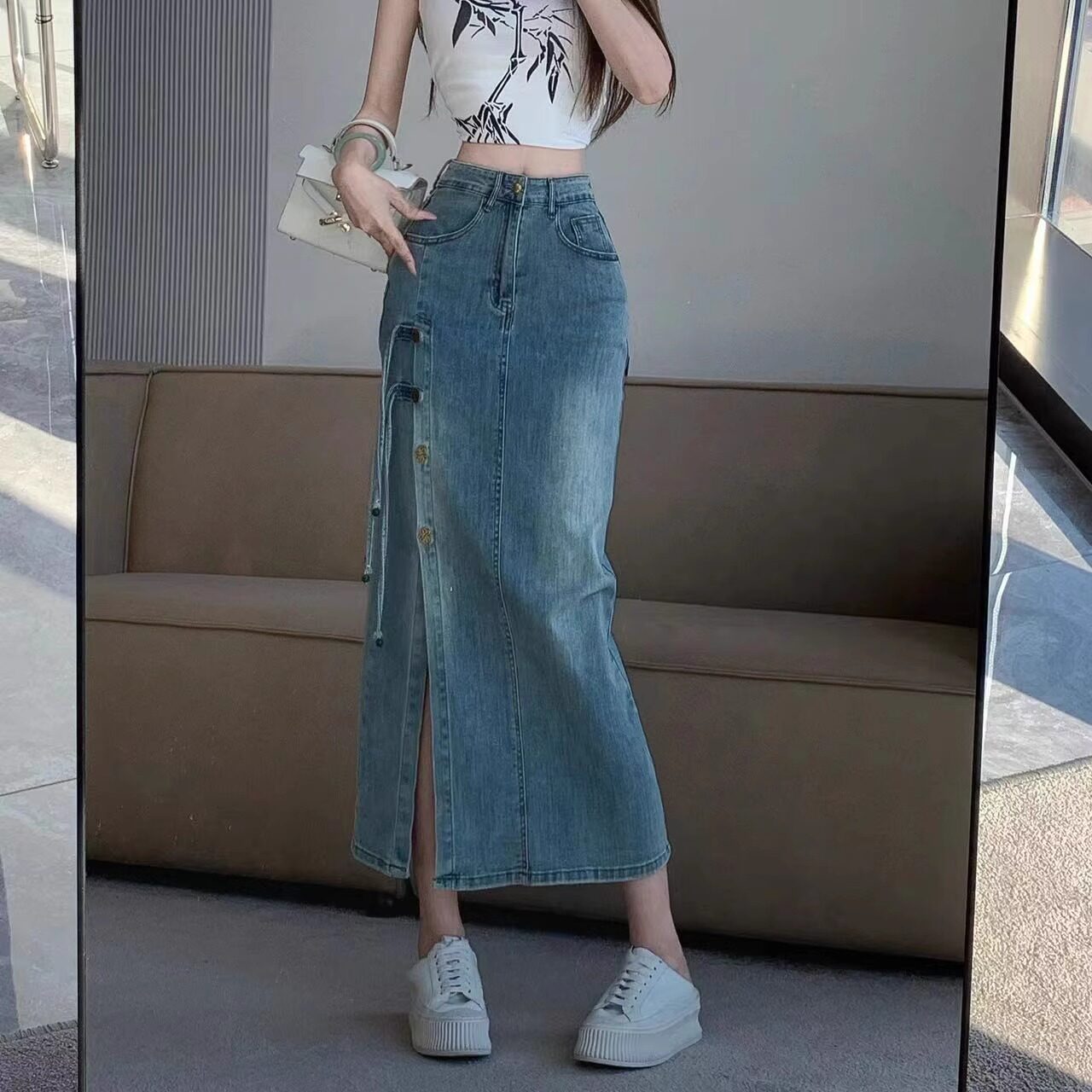 夏季薄款牛仔半身裙女小个子新中式高腰设计感开叉a字包臀中长裙