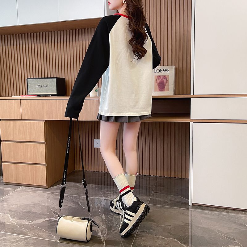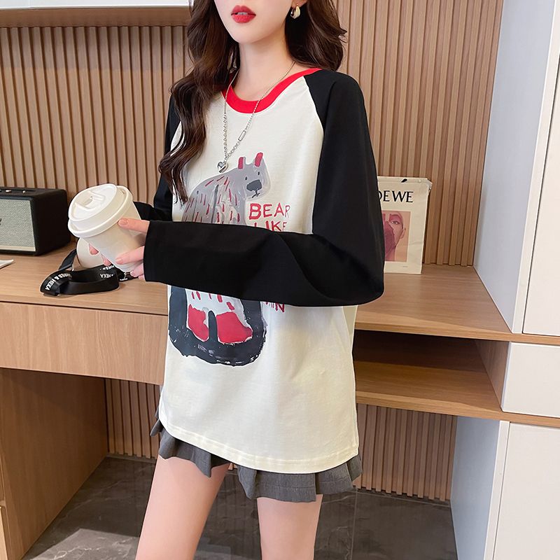 美式重磅纯棉宽松长袖打底衫t恤女春秋卡通休闲印花插肩撞色上衣