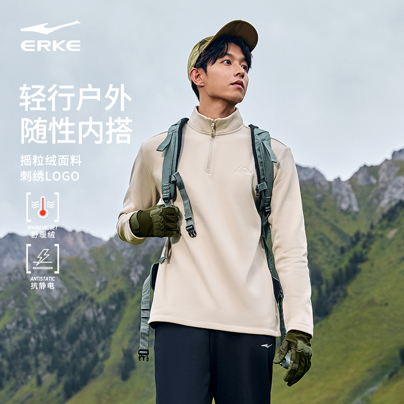 鸿星尔克卫衣男2025秋季新款男士户外内搭加绒高领抓绒衣套头上衣