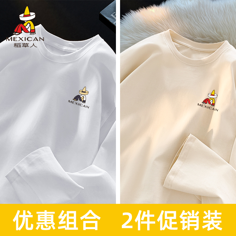 稻草人纯棉长袖t恤男款米色2025秋季宽松圆领大码潮牌上衣打底衫K