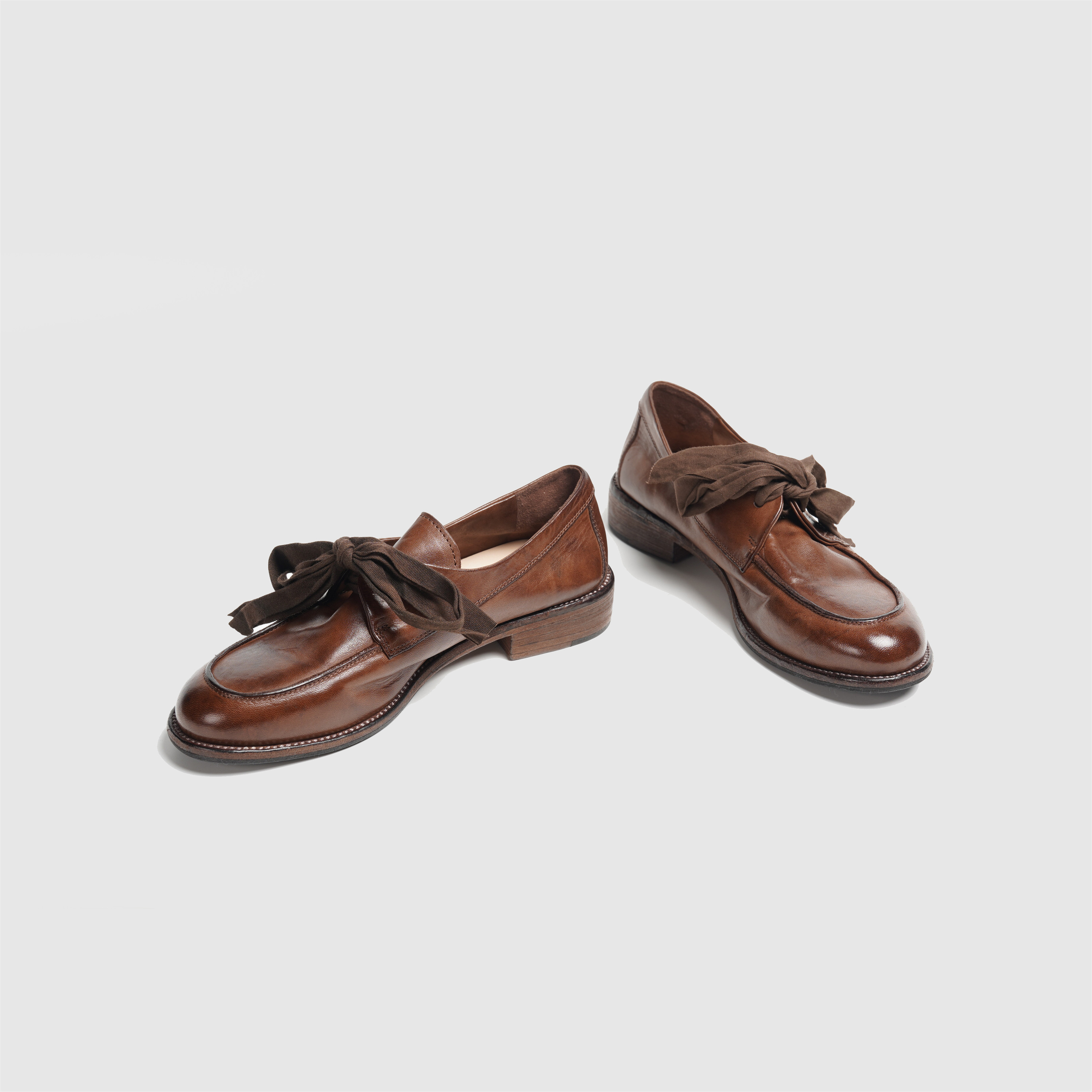 水洗马皮英伦风丝绸蝴蝶结乐福鞋 做旧复古圆头舒适手工小皮鞋女