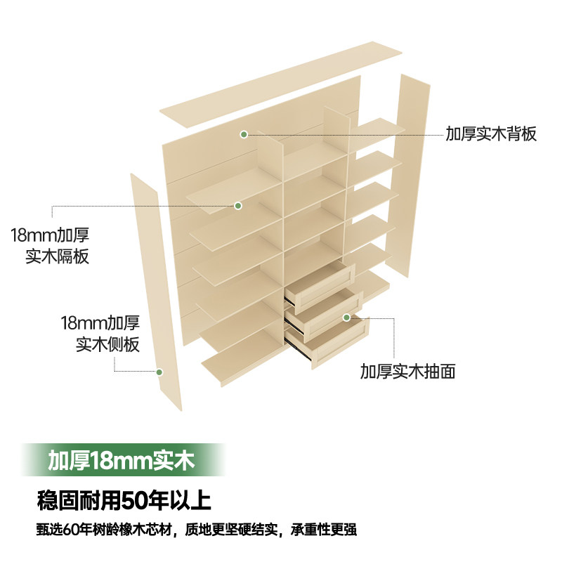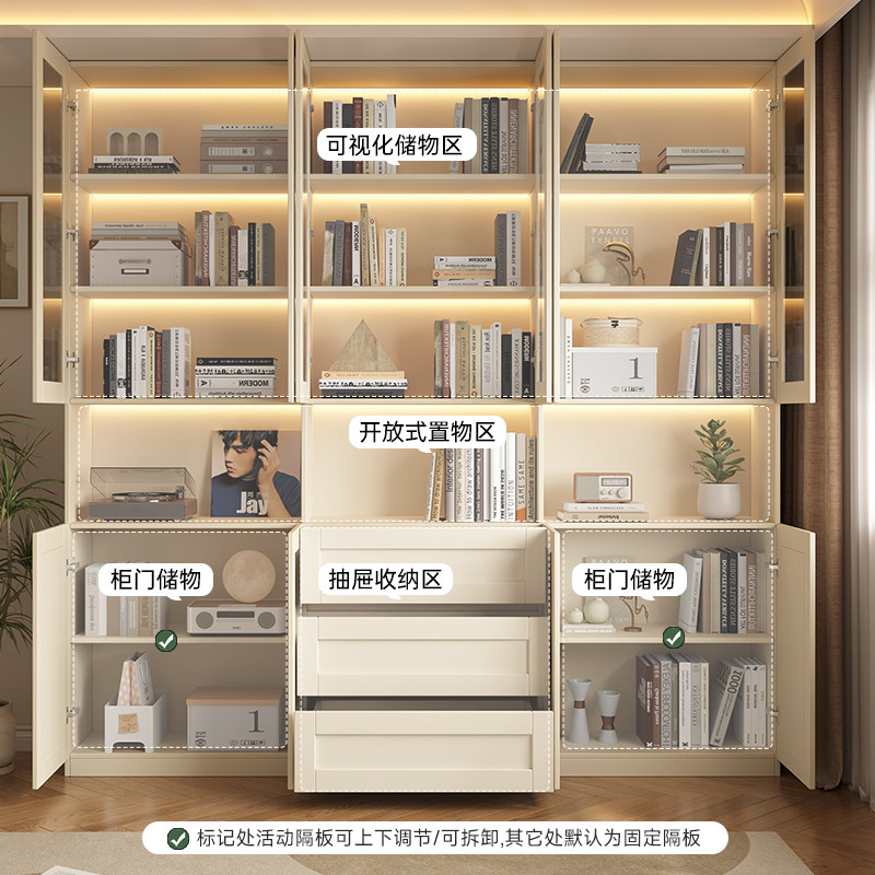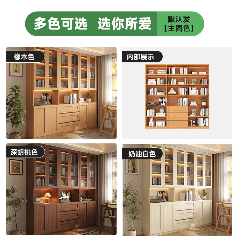 定制实木书柜满墙橡木收纳柜家用玻璃到顶展示柜落地奶油白书架