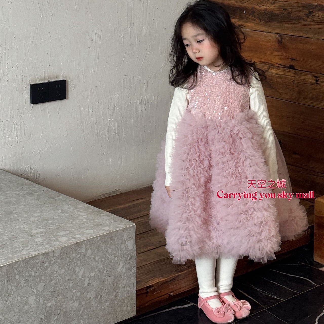 天空正版粉色网纱公主风儿童礼服女童蝴蝶结亮片羽毛蛋糕裙蓬蓬裙