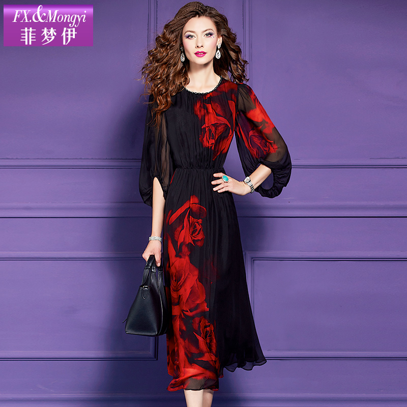 菲梦伊100桑蚕丝印花钉珠连衣裙女春季复古高端真丝阔太太长裙子