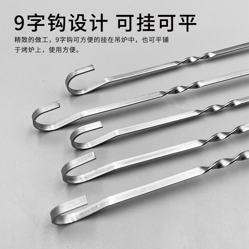 40cm吊炉扁签 子不锈钢烤肉签子 9字型带勾加厚吊灌勾型烧烤工具
