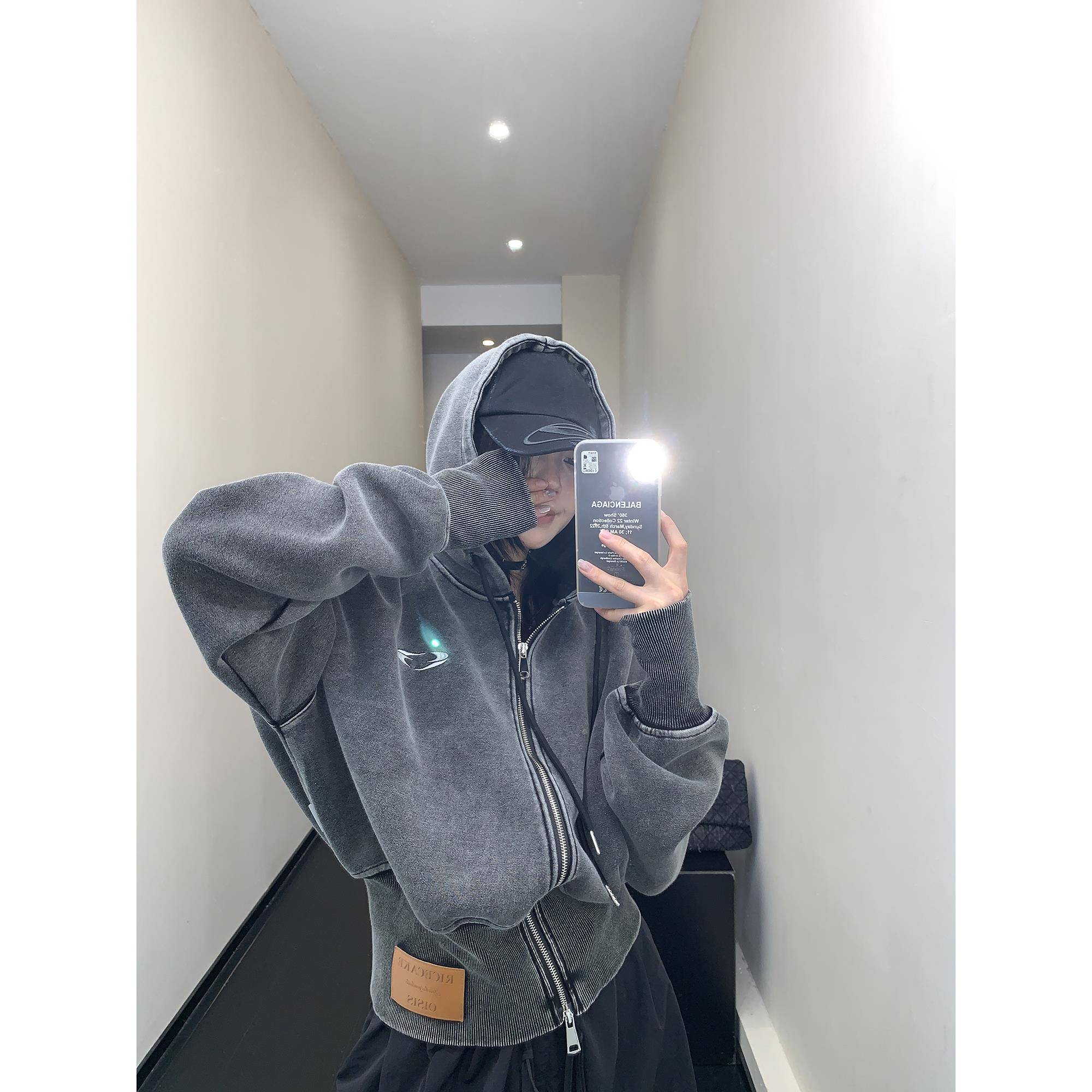 废柴春季小众做旧加宽螺纹短款薄款连帽外套女宽松重工收腰夹克潮