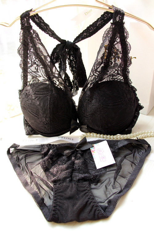 新款 性感简约薄型聚拢侧扣内衣挂脖交叉美背女文胸蕾丝内衣套装