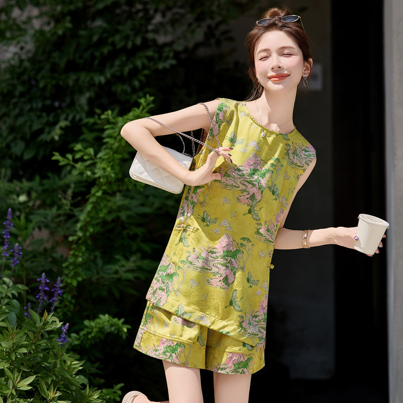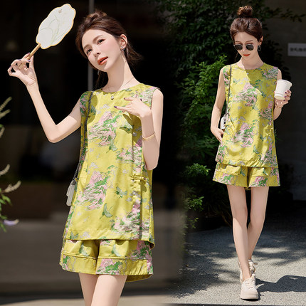 新中式国风套装女2025夏季新款小个子印花短裤休闲时尚两件套遮肚