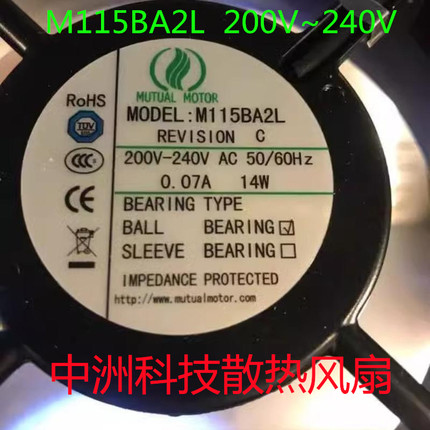 全新美途 M115BA2L 200V-240V AC 0.07A 11W/14W滚珠机柜散热风扇