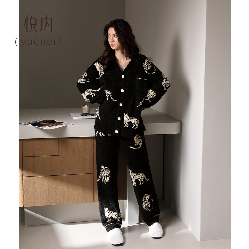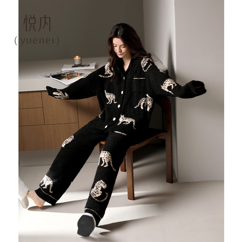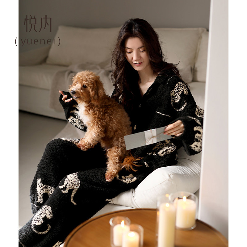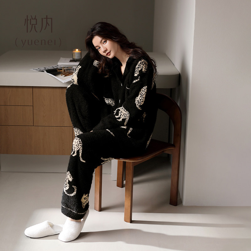 悦内半边绒睡衣女秋冬季冬款珊瑚绒加绒加厚家居服保暖黑色老钱风