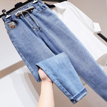 大码弹力牛仔裤女宽松胖妹妹裤子松紧腰显瘦200斤加肥加大哈伦裤