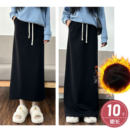 黑色半身裙女高个子加长a字裙秋冬加绒加厚高腰显瘦开叉超长裙子