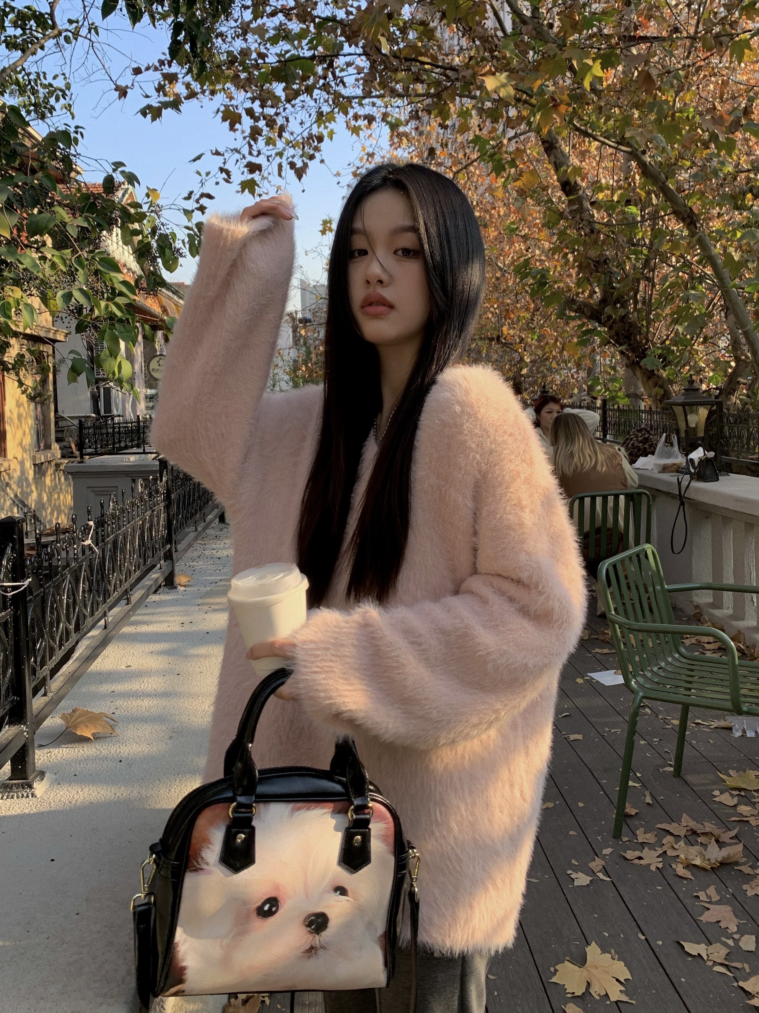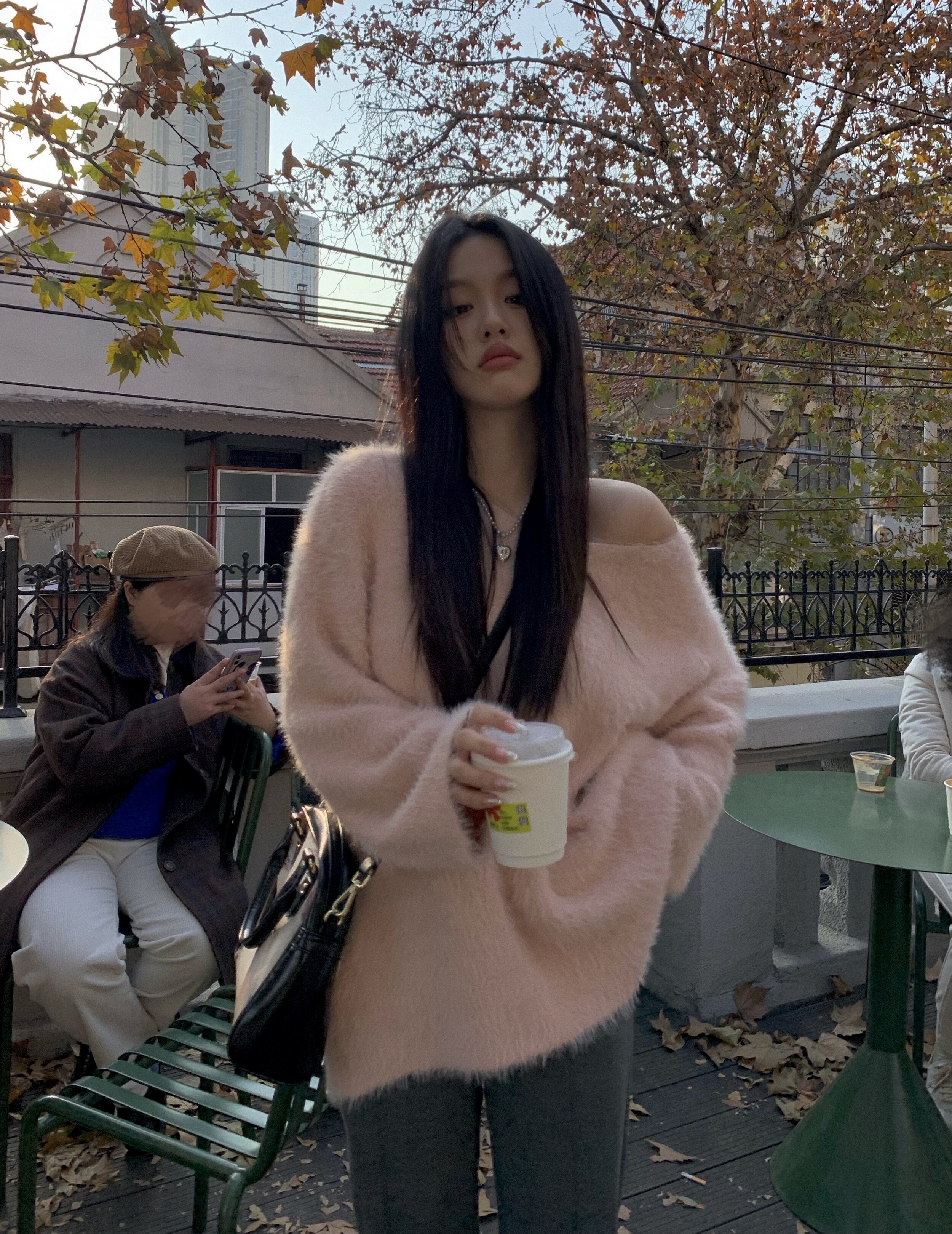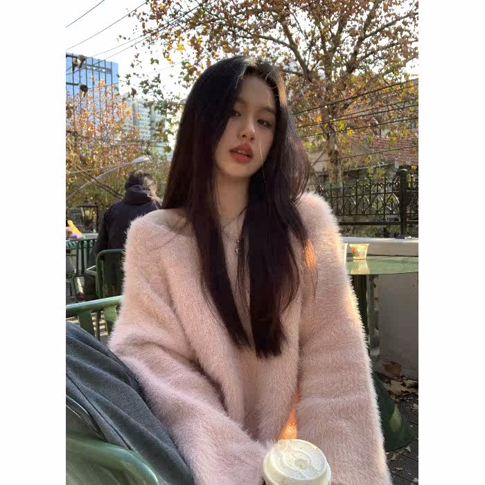 软糯慵懒风粉色V领针织毛衣女秋冬季小众高级感宽松温柔韩系上衣
