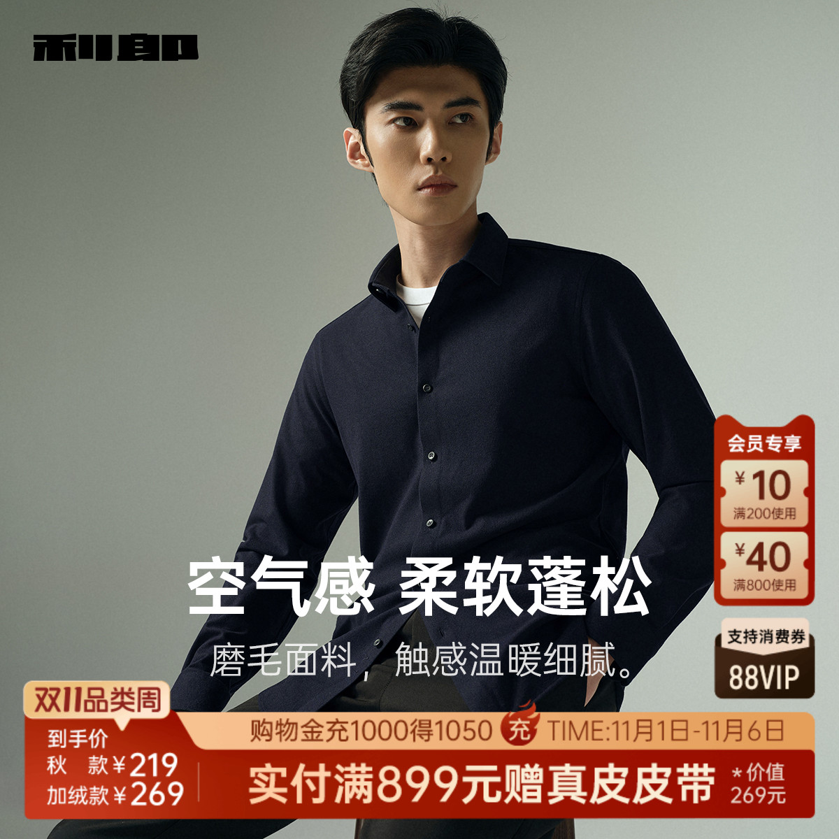 利郎官方秋季尖领休闲磨毛衬衫