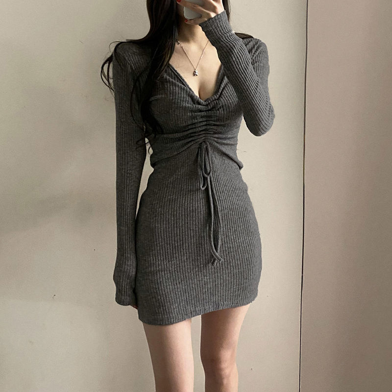 韩版女人味性感抽绳v领紧身连衣裙显瘦收腰包臀显身材打底短裙ins