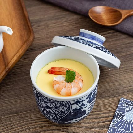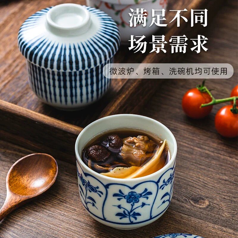 日本进口美浓烧陶瓷带盖炖盅一人食日式蛋盅蓝染隔水蒸蛋碗汤煲