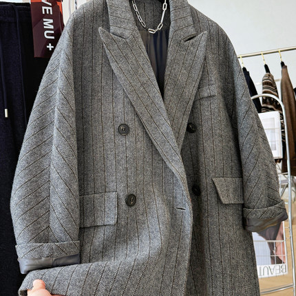 高级感西装领条纹纯羊毛呢子大衣女秋冬慵懒风宽松西装毛呢外套