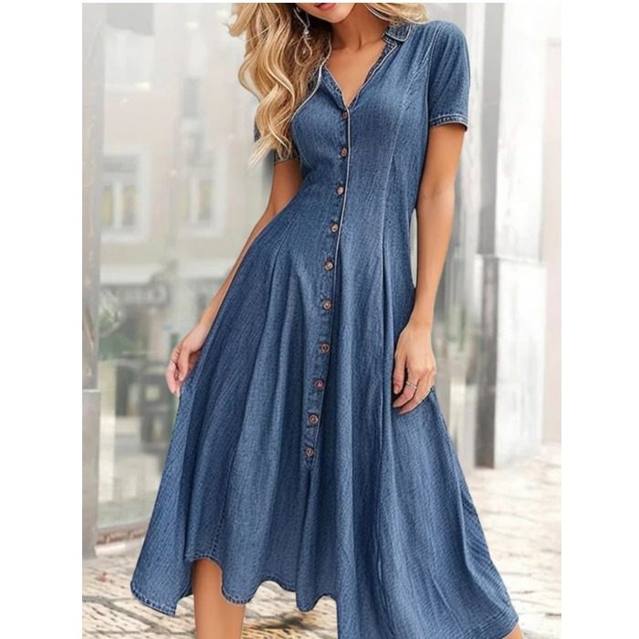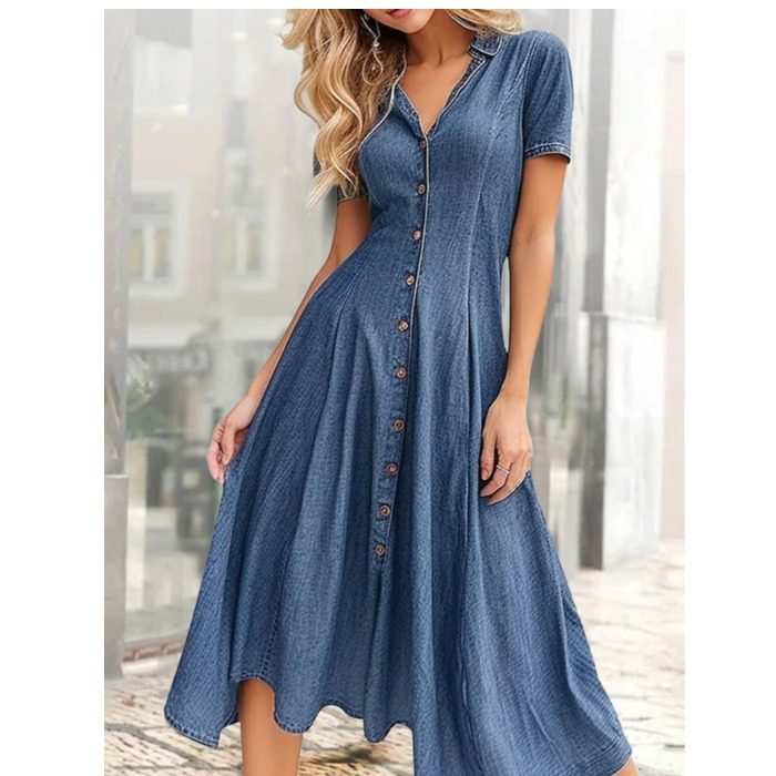 跨境欧美速卖通时尚夏季新款V领单排扣休闲中长款短袖牛仔连衣裙