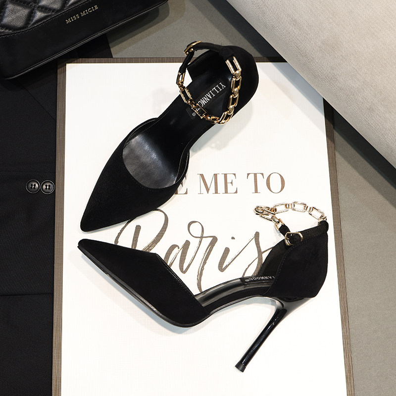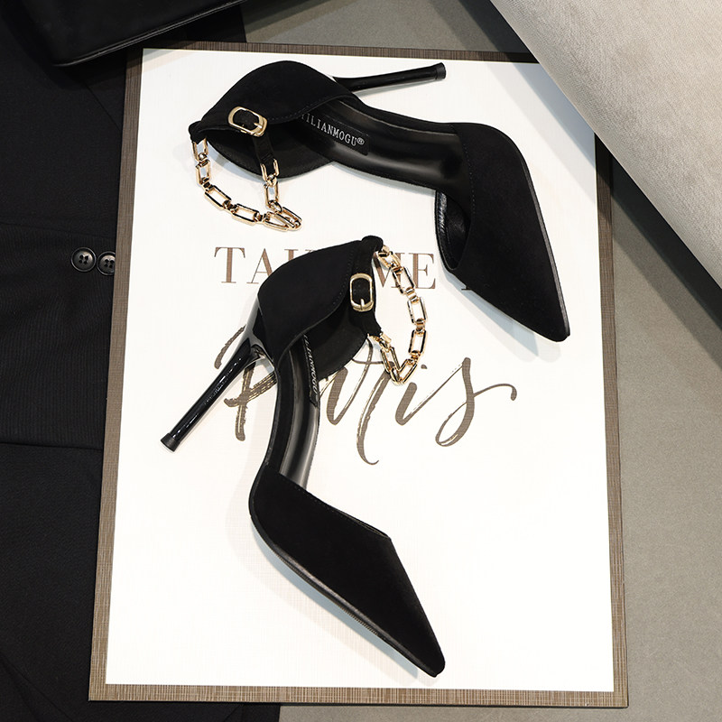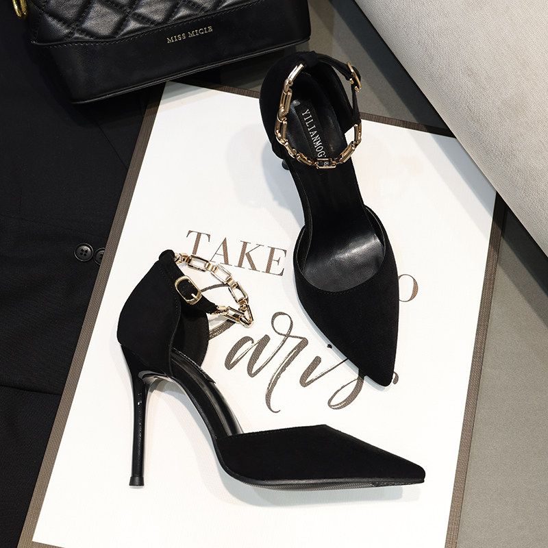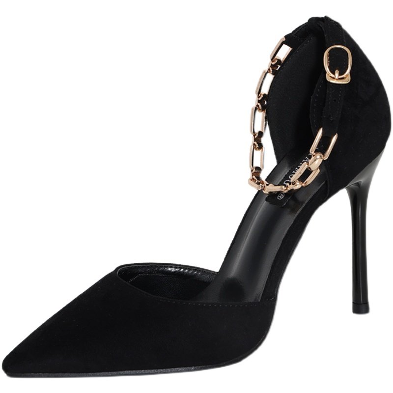 2025年春季高跟鞋女细跟百搭尖头一字扣带法式绒面金属链单鞋女鞋