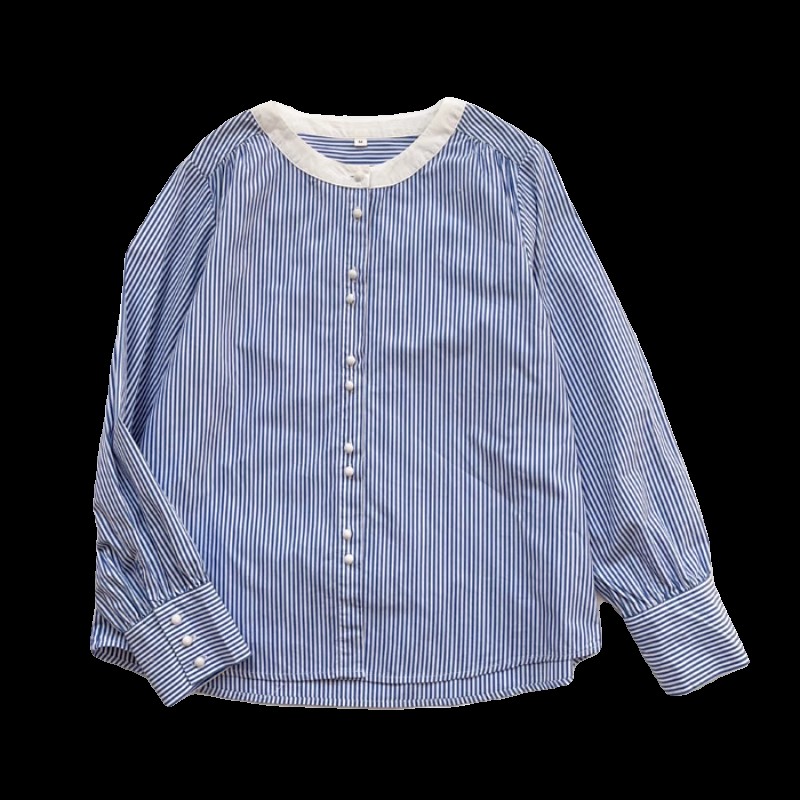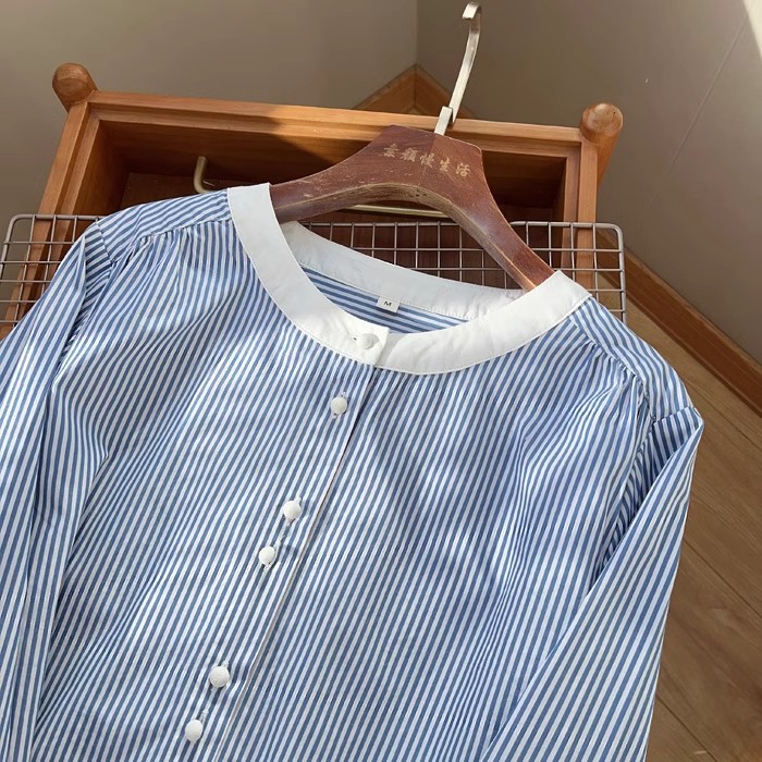 设计感小众韩系条纹衬衫女春季内搭叠穿撞色圆领上衣休闲打底衬衣